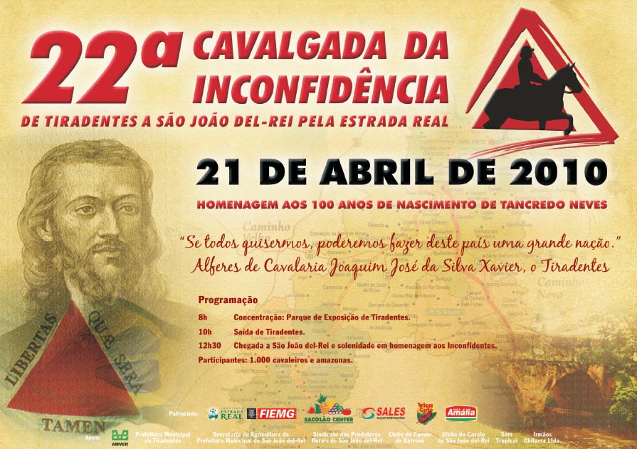 Cavaleiros de várias partes da região dos Campos das Vertentes já se deslocam para Tiradentes, de onde sai amanhã, às 10h, a 22ª Cavalgada da Inconfidência. Neste ano, o evento homenageia o centenário do nascimento do sãojoanense Tancredo Neves, além das tradicionais homenagens a Tiradentes e aos demais inconfidentes.