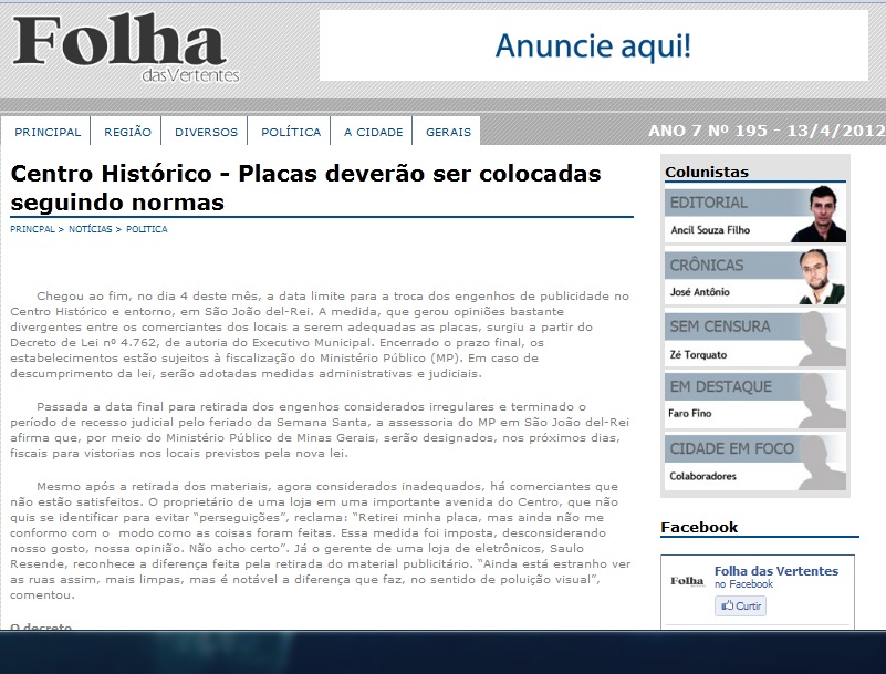 Fonte: Folha das Vertentes em 13 de Abril de 2012