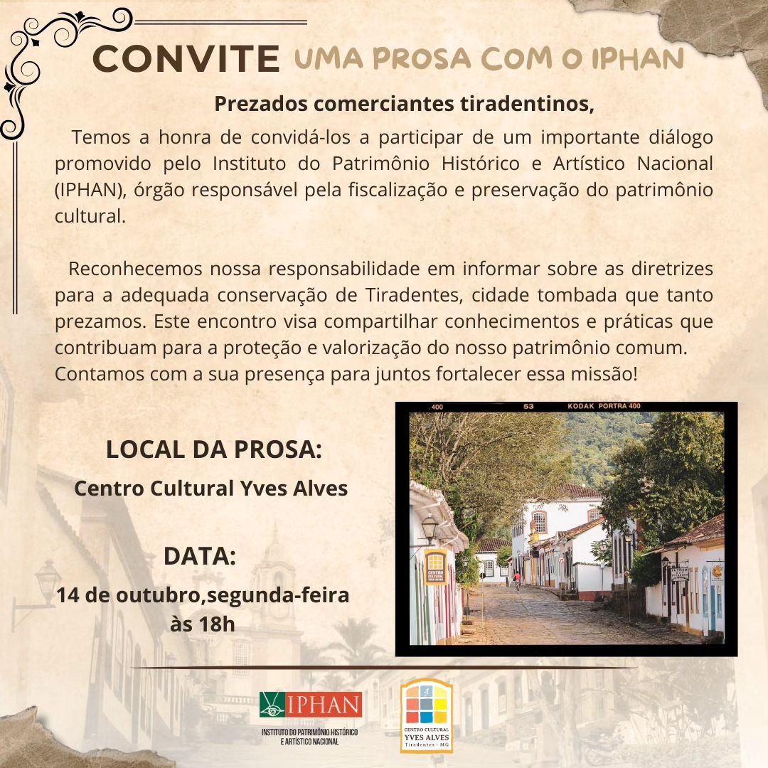 O Instituto do Patrimônio Histórico e Artístico Nacional (IPHAN) realizará um encontro no dia 14 de outubro, às 18h, no Centro Cultural Yves Alves, em Tiradentes. O evento tem como objetivo discutir a correta aplicação das normas de funcionamento na área tombada da cidade, com foco em esclarecer conflitos e dificuldades enfrentados por empreendimentos comerciais.