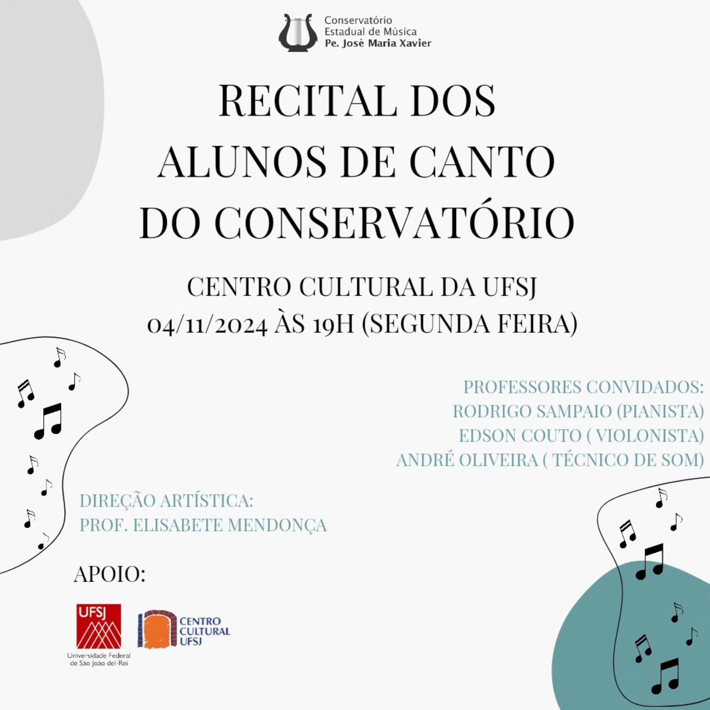 O Recital dos alunos de canto do Conservatório, com a classe da professora Elisabete Mendonça, ocorrerá no dia 4 de novembro (segunda-feira), às 19h, no Centro Cultural UFSJ (Solar da Baronesa). Este evento reunirá alunos que apresentarão uma variedade de peças musicais, refletindo o aprendizado e a prática do canto ao longo do semestre.