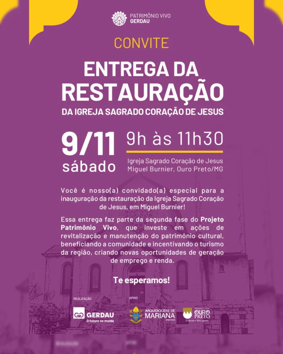 A cerimônia de entrega da restauração da Igreja Sagrado Coração de Jesus, em Miguel Burnier, será realizada neste sábado, 9 de novembro, das 9h às 11h30. Este evento marca um importante passo na segunda fase do Projeto Patrimônio Vivo, que tem como objetivo a revitalização e preservação do patrimônio cultural local. A iniciativa busca trazer benefícios para a comunidade, promovendo o turismo e a economia local por meio da geração de emprego e renda.