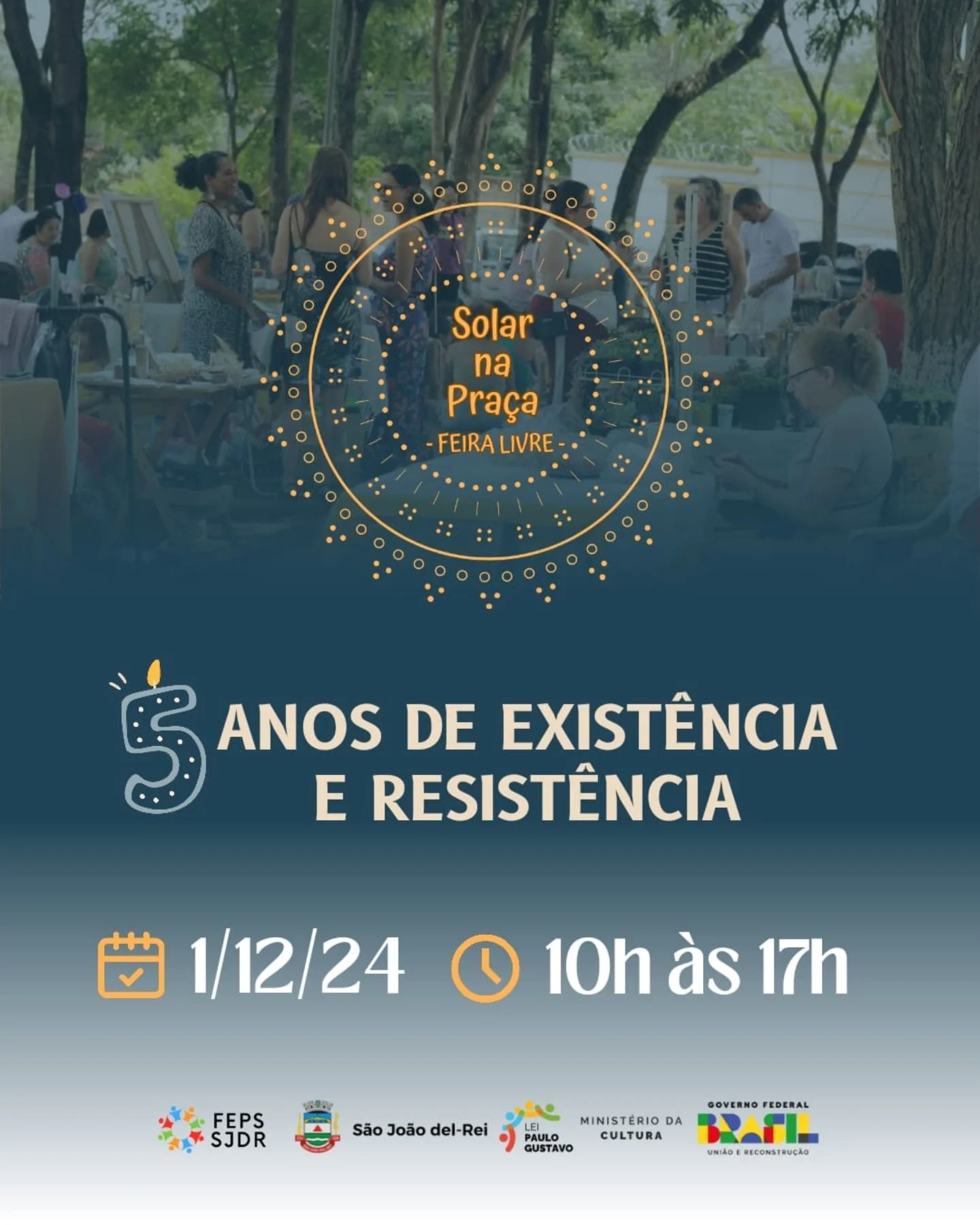 A Solar na Praça Feira Livre comemora seus 5 anos de existência e resistência no próximo domingo, 1º de dezembro, em São João del-Rei, com uma programação incrível na Praça Ovídeo Vicentini - Solar da Serra, das 10h às 17h. O evento marca uma trajetória de sucesso construída em parceria com a Economia Popular Solidária, destacada pela recente aprovação do projeto na Lei Paulo Gustavo. A edição especial contará com a presença de artesãs talentosas e diversas atrações, sendo uma ótima oportunidade para celebrar e garantir presentes exclusivos para o Natal.