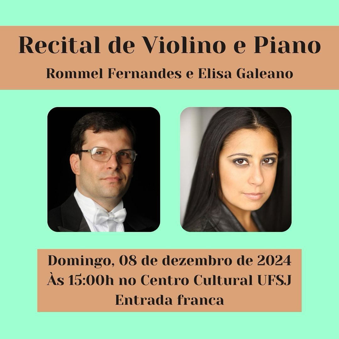 O Curso de Música da UFSJ, em parceria com a Ação Cultural Artes Vertentes, promove no próximo domingo, 8 de dezembro, o Recital de Violino e Piano com os músicos Rommel Fernandes e Elisa Galeano. O evento será realizado às 15h no Centro Cultural UFSJ, em São João del-Rei, e promete trazer ao público uma seleção especial de peças clássicas, destacando o virtuosismo e a harmonia entre os dois instrumentos.