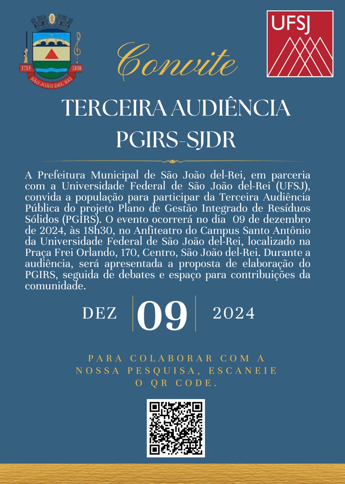 A Prefeitura Municipal de São João del-Rei, em parceria com a Universidade Federal de São João del-Rei (UFSJ), convida a população para participar da Terceira Audiência Pública do PGIRS (Plano de Gestão Integrada de Resíduos Sólidos). O evento ocorrerá no dia 09 de dezembro de 2024, às 18h30, no Anfiteatro do Campus Santo Antônio da UFSJ, localizado na Praça Frei Orlando, 170, Centro, São João del-Rei.