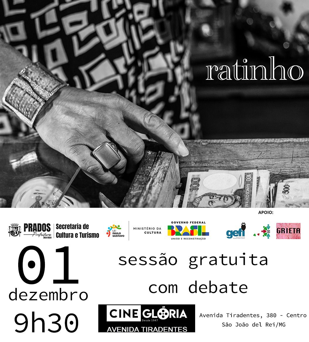 Exibição gratuita do documentário "Ratinho" acontece no Cine Glória Avenida, em São João del-Rei, no dia 1 de dezembro de 2024, às 9h30. Após a exibição, haverá um debate com a equipe do filme e o homenageado, seguido pela exibição do longa "Férias Trocadas". O documentário retrata a trajetória de Ivaci Lopes de Oliveira, conhecido como Ratinho, figura emblemática de Prados, reconhecido por preservar a memória local por meio de um acervo único que inclui objetos, fotografias, livros e mapas, além de sua participação marcante no carnaval da cidade.