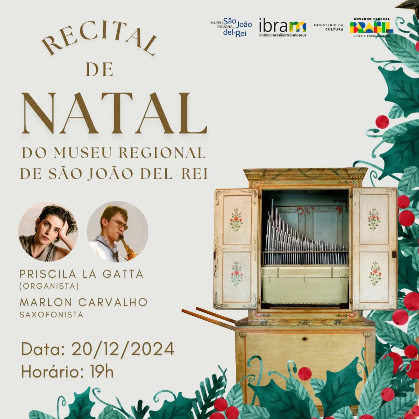 No dia 23 de dezembro de 2024, às 20h, o Museu Regional de São João del-Rei receberá um recital de Natal, apresentado pela organista Priscila La Gatta e o saxofonista Marlon Carvalho. O concerto contará com adaptações de sambas e choros feitas especialmente para o órgão de tubos do museu. O repertório inclui composições de grandes nomes da música brasileira, como Pixinguinha, Noel Rosa, Chiquinha Gonzaga, Ernesto Nazareth, Ary Barroso e Jacob do Bandolim.