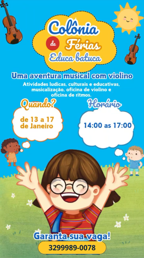 A Colônia de Férias Educa Batuca, edição de 2025, convida pessoas de todas as idades a explorar o mundo do violino em aulas dinâmicas e envolventes. O programa é uma oportunidade para iniciantes ou entusiastas desenvolverem habilidades musicais enquanto se divertem e fazem novas amizades.