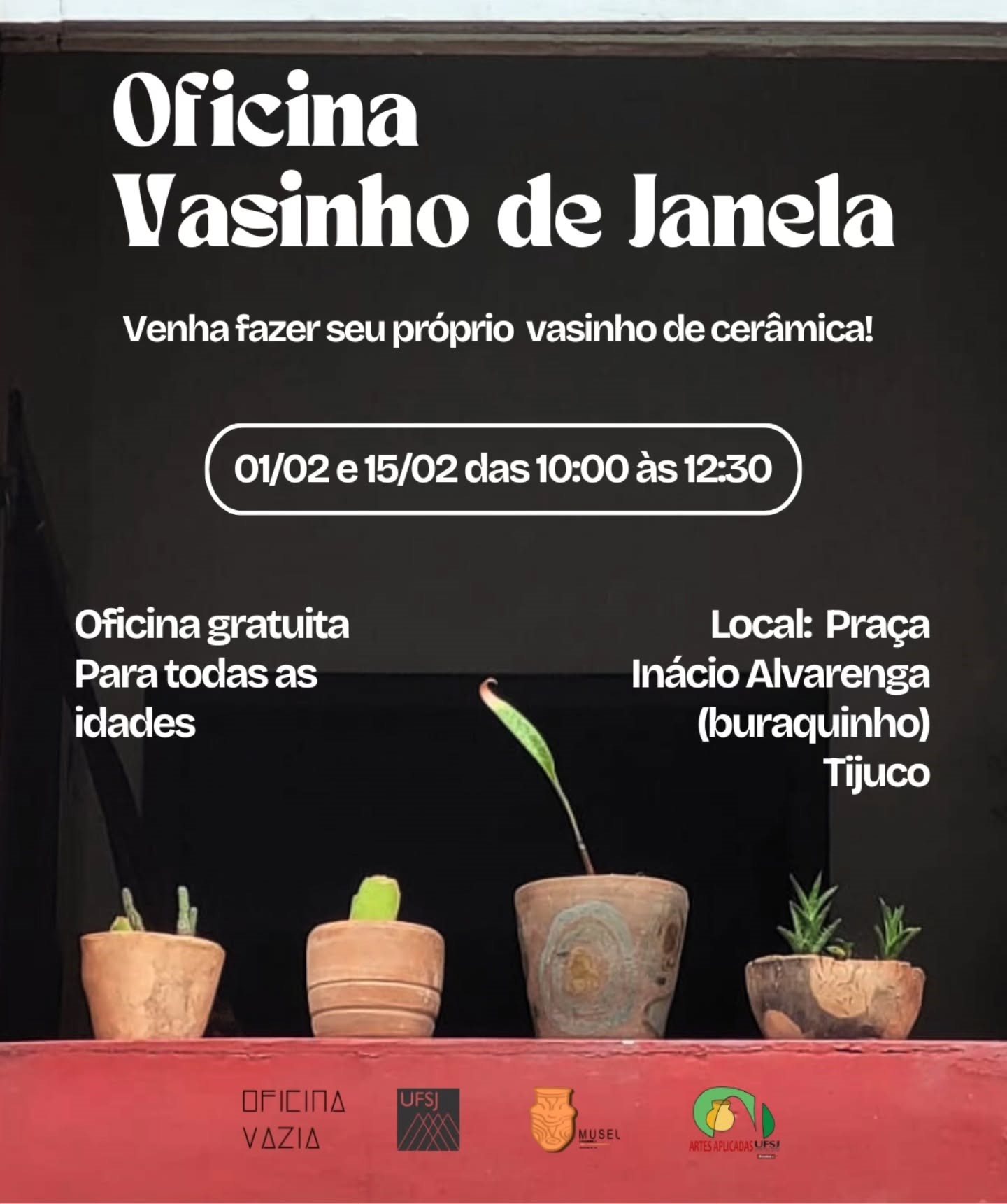 A Oficina de Vasinho de Janela acontece nos dias 01 e 15 de fevereiro, na Praça Inácio Alvarenga, no bairro Tijuco, em São João del-Rei. No primeiro encontro, os participantes aprenderão a modelar vasinhos de cerâmica, sem necessidade de experiência prévia. No segundo dia, os vasos já queimados serão entregues, prontos para receber as plantas escolhidas pelos participantes.