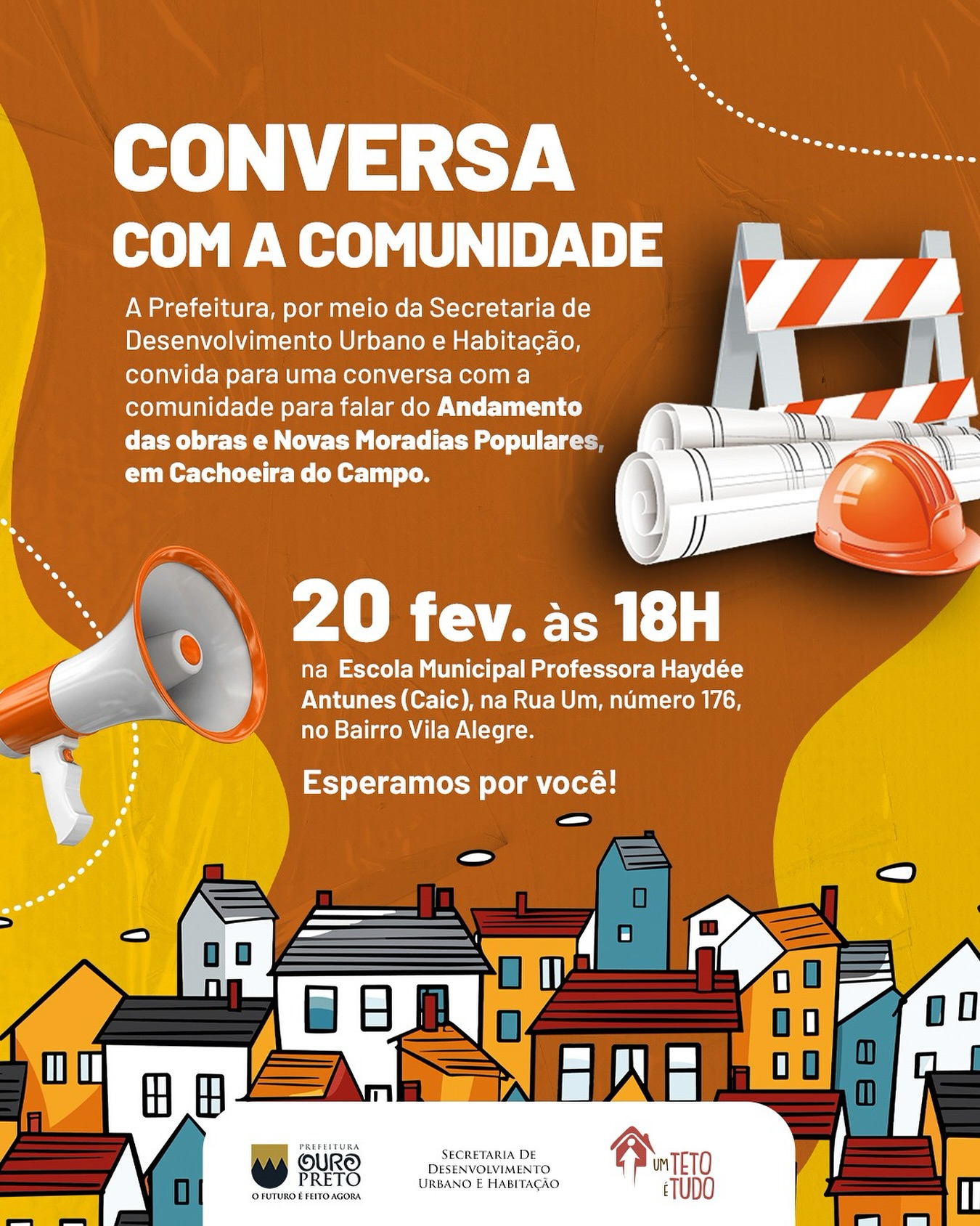 A prefeitura de Ouro Preto convida a todos os cidadãos para a Conversa com a Comunidade sobre Moradias Populares, que será realizada no dia 20 de fevereiro, às 18h, na Escola Municipal Professora Haydée Antunes (Caic), em Cachoeira do Campo. O encontro tem o objetivo de apresentar atualizações sobre o andamento das obras e permitir que a população acompanhe de perto o progresso do projeto.