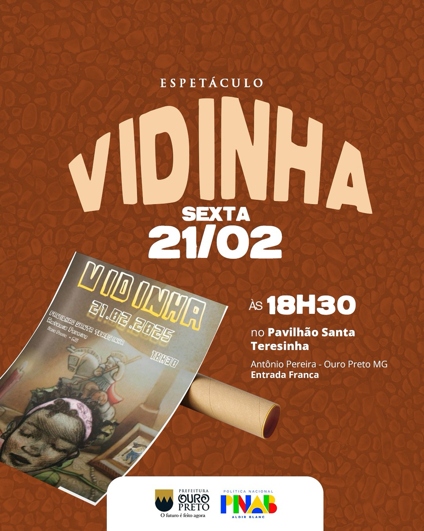O Espetáculo "Vidinha" será apresentado na sexta-feira, às 18h30, no Pavilhão Santa Teresinha, localizado no distrito de Antônio Pereira. A peça conta a trajetória de uma moradora de rua que, em meio a diversas aventuras, mantém uma forte devoção a São Jorge.