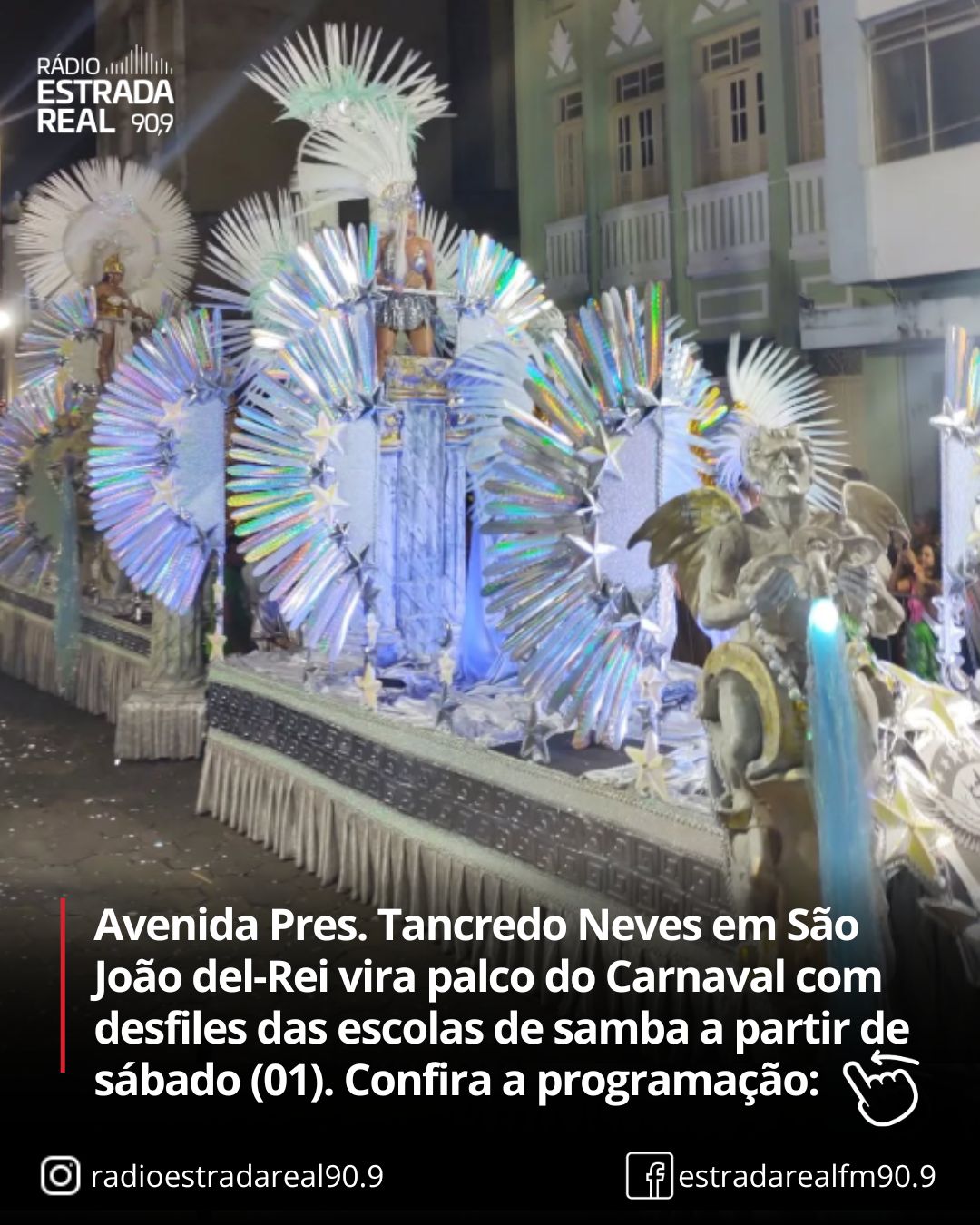 A Avenida Tancredo Neves será o palco dos desfiles oficiais das escolas de samba de São João del-Rei nos dias 1º e 2 de março de 2025. O evento reunirá as agremiações locais em apresentações que destacam a tradição, o ritmo e a criatividade do carnaval da cidade. Os desfiles começam no sábado e continuam no domingo dia 2 de março, com a apuração no dia 3 de março e desfile das campeãs no dia 4.