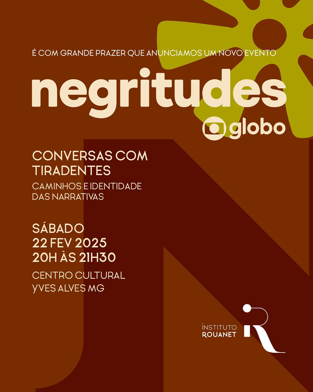 A mesa de conversa “Caminhos e Identidades das Narrativas” será realizada no sábado, 22 de fevereiro, às 20h, no Centro Cultural Yves Alves, em Tiradentes. O evento, promovido pelo Instituto Rouanet em parceria com o projeto Negritudes Globo, reunirá o ator e diretor Lázaro Ramos e outros criadores do audiovisual para uma discussão sobre as escolhas narrativas e a valorização das identidades na produção cultural. A mediação será da jornalista Aline Aguiar, da Globo Minas.