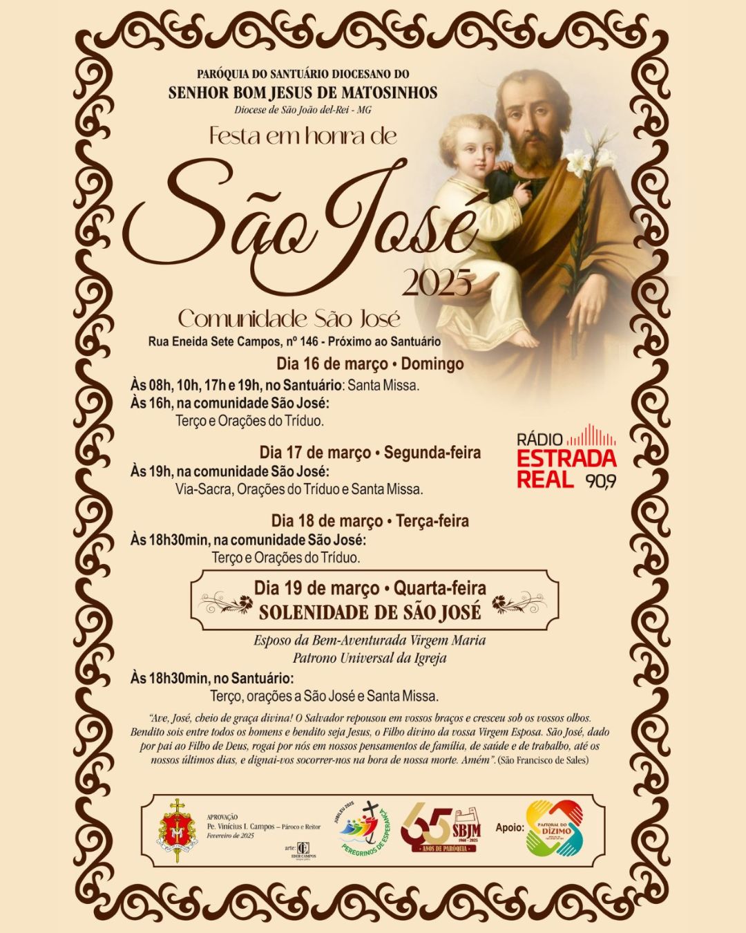 A Festa em honra a São José 2025, organizada pela Paróquia do Santuário Diocesano do Senhor Bom Jesus de Matosinhos, será realizada entre os dias 16 e 19 de março. A programação inclui missas, terço e orações no Santuário e na Comunidade São José, reunindo fiéis para momentos de devoção e reflexão.