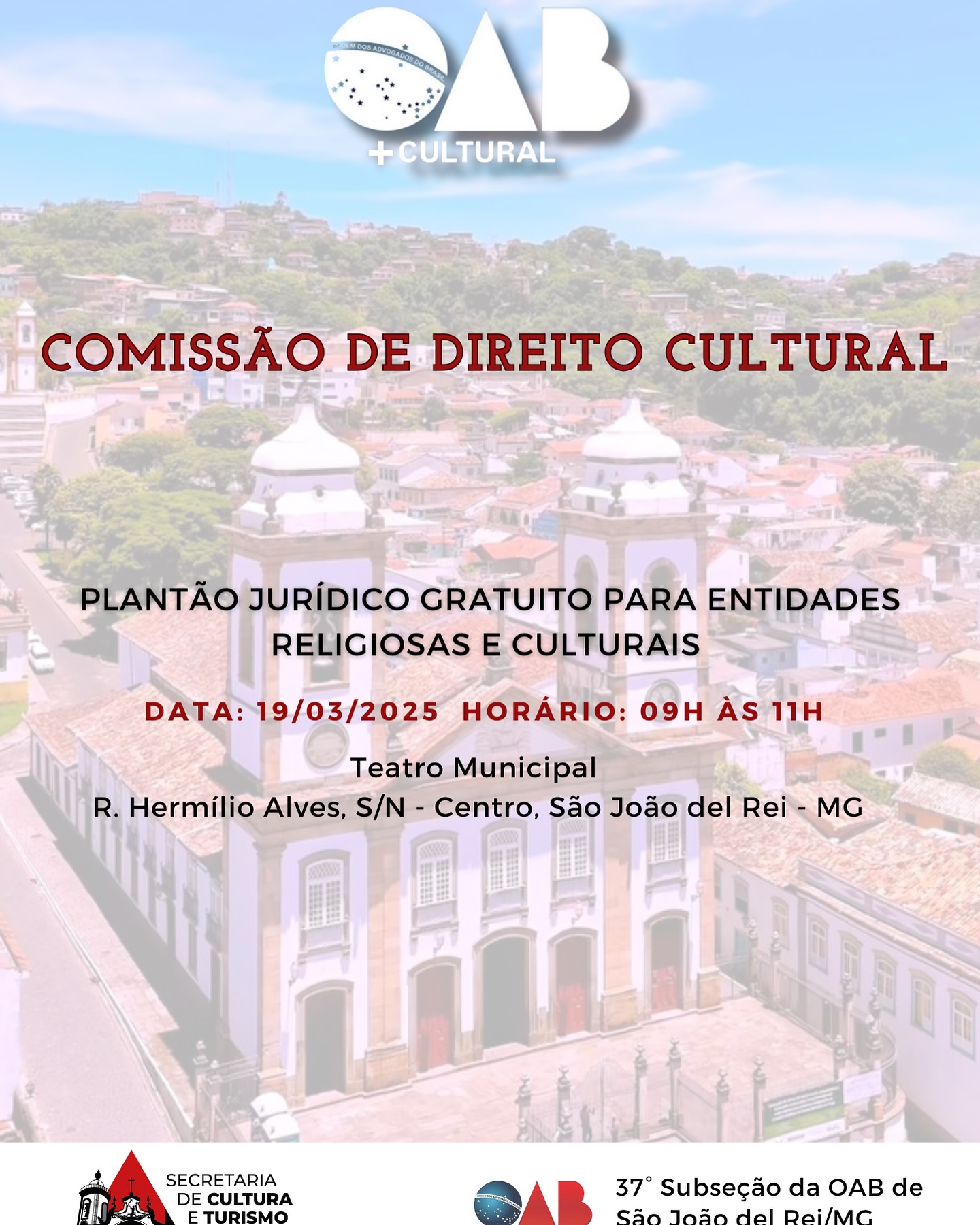 A 37ª Subseção da OAB/MG de São João del-Rei, por meio da Comissão de Direito Cultural, em parceria com a Secretaria de Cultura de São João del-Rei, realiza o Plantão Jurídico Cultural no dia 19 de março de 2025, das 9h às 11h, no Teatro Municipal, localizado na Rua Hermílio Alves, s/n, Centro. O atendimento será gratuito e voltado para entidades do setor cultural.