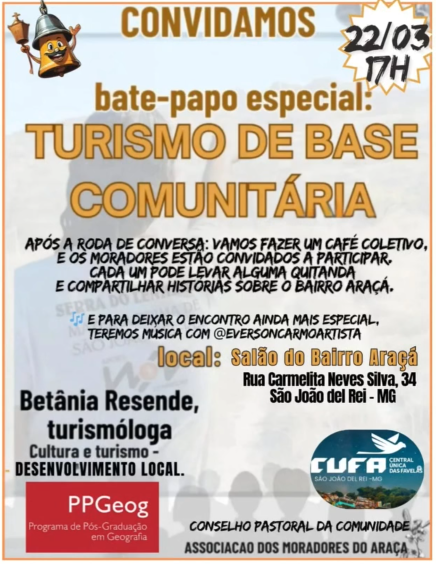 O bate-papo "Turismo de Base Comunitária" será realizado no dia 22 de março, às 17h, no Salão do Bairro Araçá, em São João del-Rei – MG. O evento contará com a participação da turismóloga Betânia Resende, que abordará a relação entre cultura, turismo e desenvolvimento local.