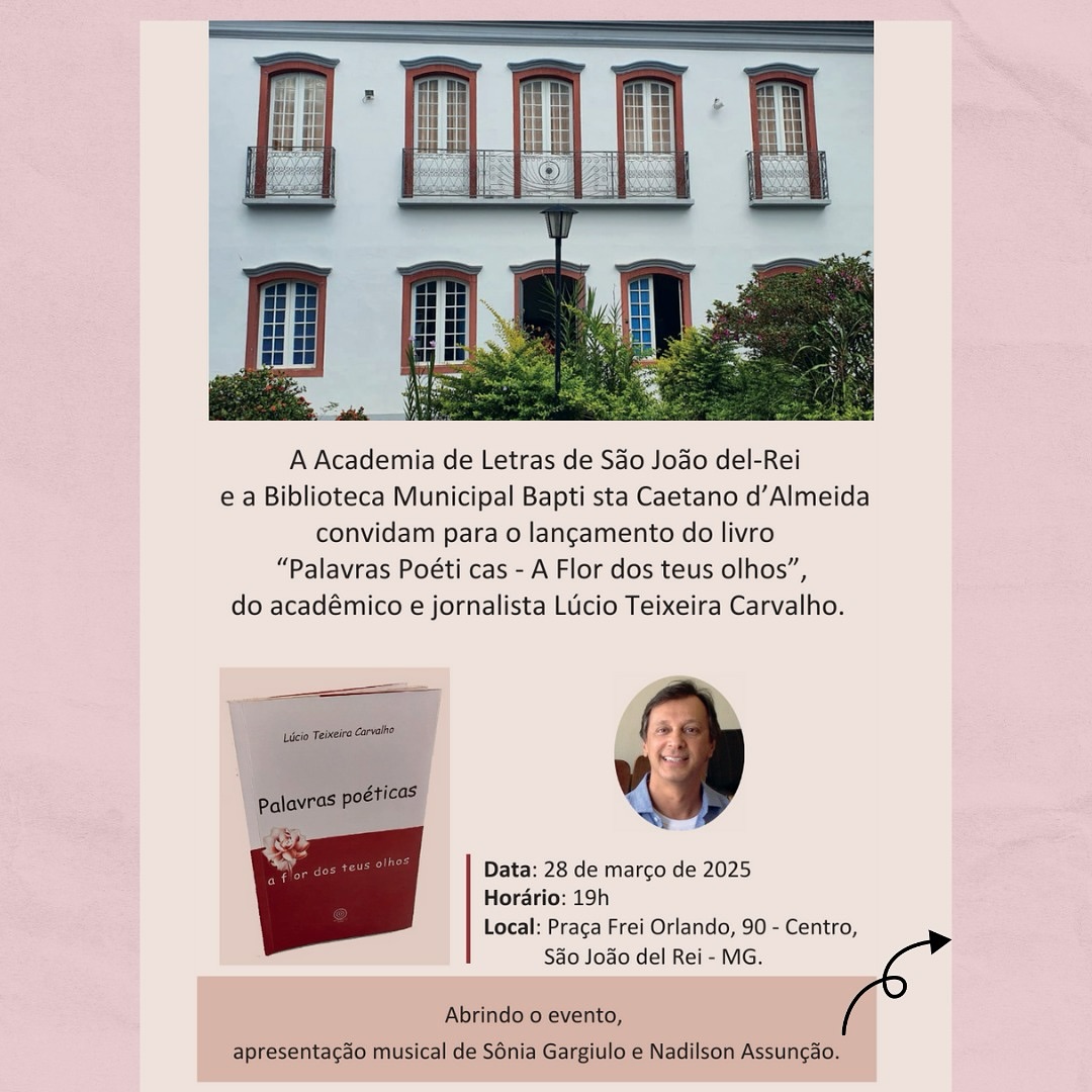 A Academia de Letras de São João del-Rei e a Biblioteca Municipal Baptista Caetano d’Almeida realizam, no dia 28 de março de 2025, o lançamento do livro "Palavras Poéticas - A Flor dos Teus Olhos", de autoria do acadêmico e jornalista Lúcio Teixeira Carvalho. O evento acontece às 19h, na Praça Frei Orlando, 90 - Centro, São João del-Rei - MG.