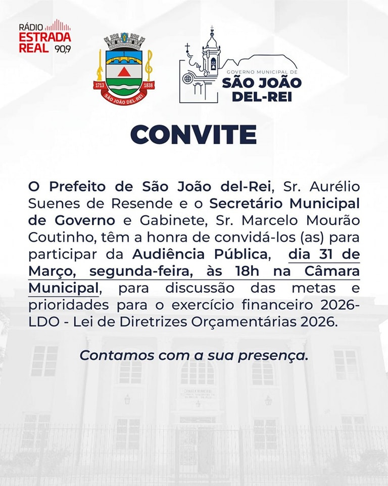 A Audiência Pública sobre a LDO 2026 será realizada no dia 31 de março de 2025, às 18h, na Câmara Municipal de São João del-Rei. Promovida pela Prefeitura de São João del-Rei, a audiência tem como objetivo debater as metas e prioridades da Lei de Diretrizes Orçamentárias (LDO) 2026. O evento contará com a presença do Prefeito Aurélio Suenes de Resende e do Secretário Municipal de Governo e Gabinete, Marcelo Mourão Coutinho.