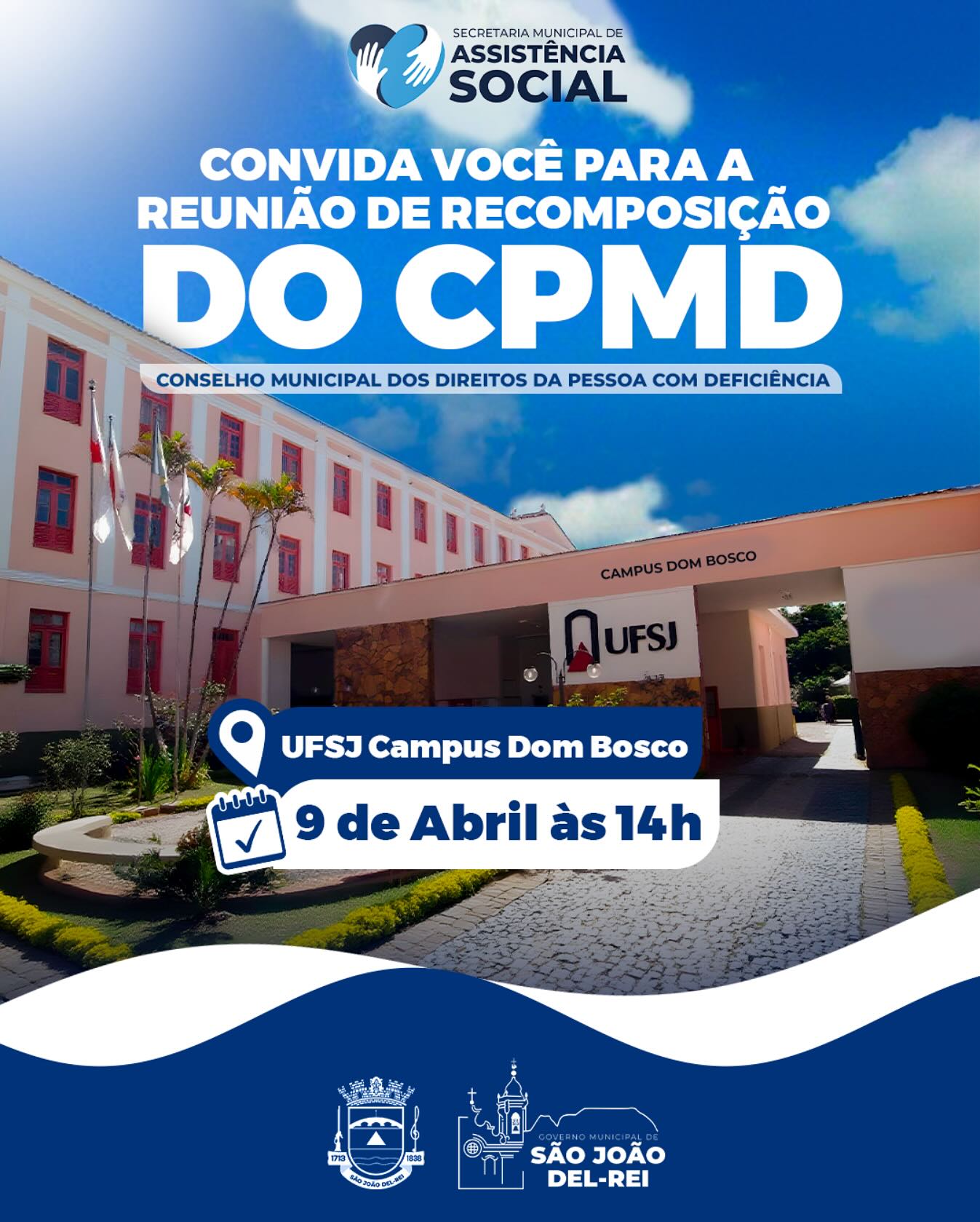 A Secretaria de Assistência Social de São João del-Rei convida a comunidade para a Reunião de Recomposição do Conselho Municipal dos Direitos da Pessoa com Deficiência (CMPD). O encontro será realizado no dia 09 de abril de 2025, às 14h, no campus Dom Bosco da Universidade Federal de São João del-Rei (UFSJ).
