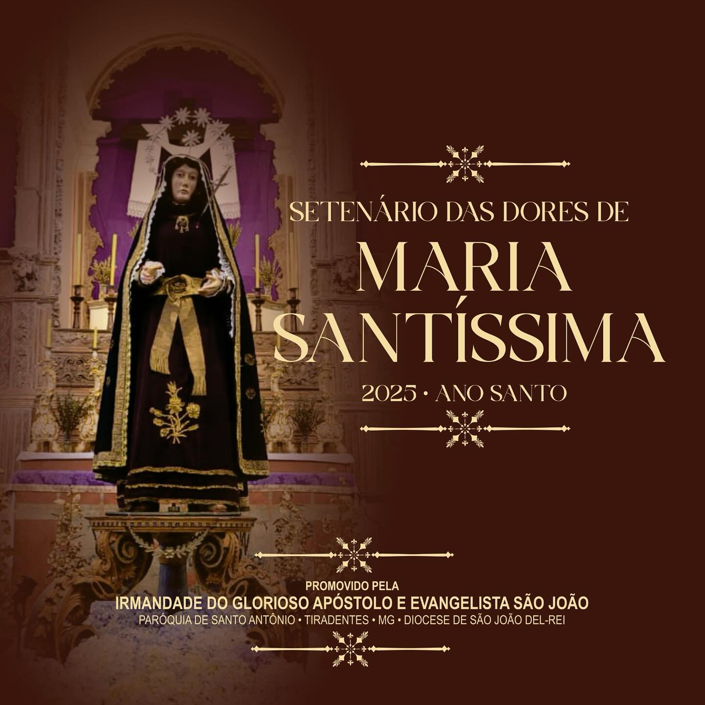 O Setenário das Dores de Maria Santíssima 2025 será promovido pela Irmandade do Glorioso Apóstolo e Evangelista São João, da Paróquia de Santo Antônio, em Tiradentes/MG, pertencente à Diocese de São João del-Rei. O evento integra o calendário litúrgico do Ano Santo Jubilar, convocado pelo Papa Francisco, e convida os fiéis a uma vivência mais intensa da espiritualidade mariana, como preparação para a Semana Santa.