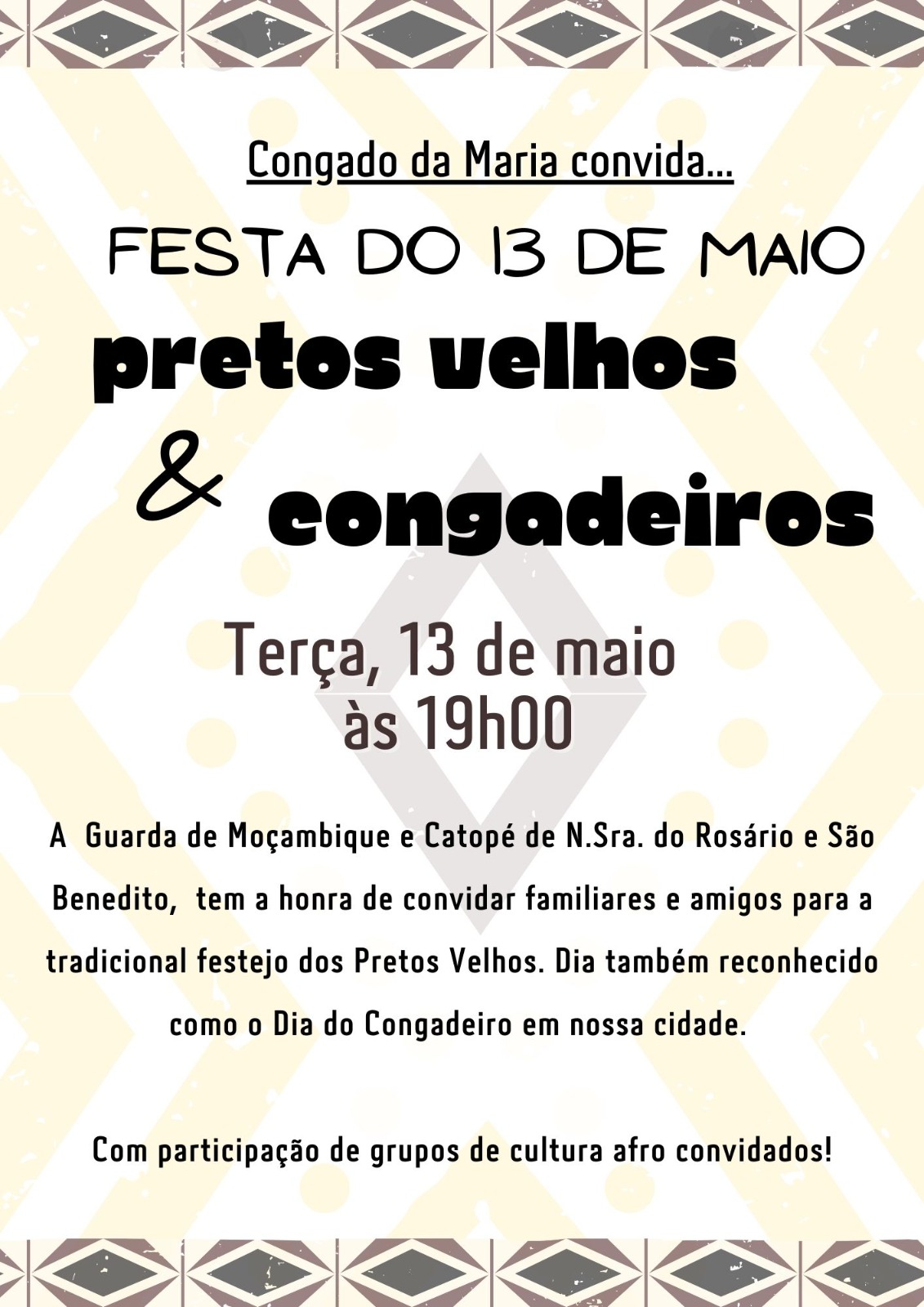 A Festa do 13 de Maio – Pretos Velhos e Congadeiros será realizada na terça-feira, 13 de maio, às 19h, com organização da Guarda de Moçambique e Catopé de Nossa Senhora do Rosário e São Benedito (Congado da Maria). O evento, tradicional na cidade, celebra os Pretos Velhos e também marca o Dia do Congadeiro, reunindo familiares, amigos e toda a comunidade em torno de expressões da cultura afro-brasileira.