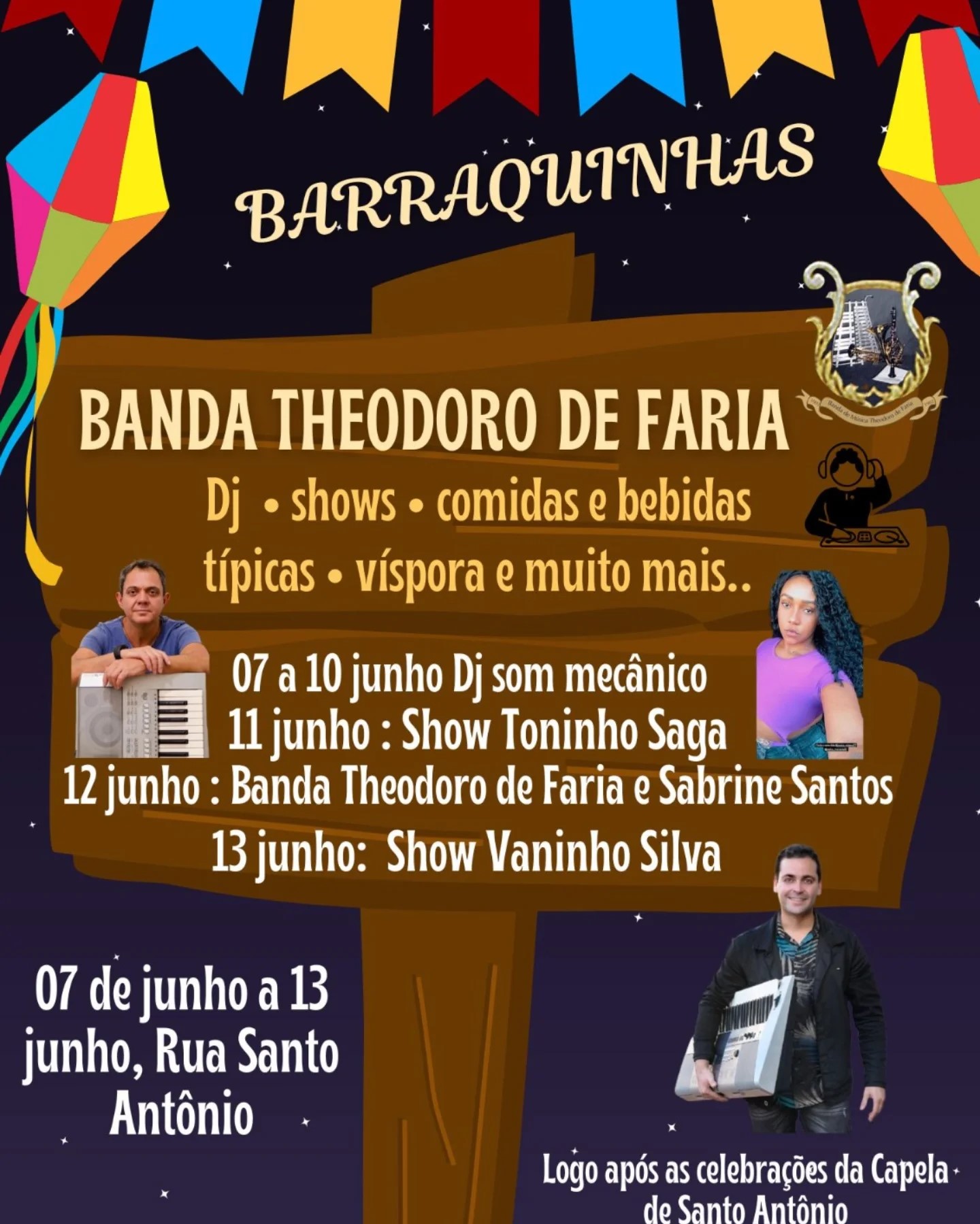 A Banda Theodoro de Faria realiza, de 7 a 13 de junho de 2025, as tradicionais Barraquinhas da Banda, em sua sede localizada na Rua Santo Antônio, 289, em São João del-Rei. O evento acontece logo após as celebrações da Capela de Santo Antônio e oferece ao público shows, comidas típicas, bebidas e programação musical variada.