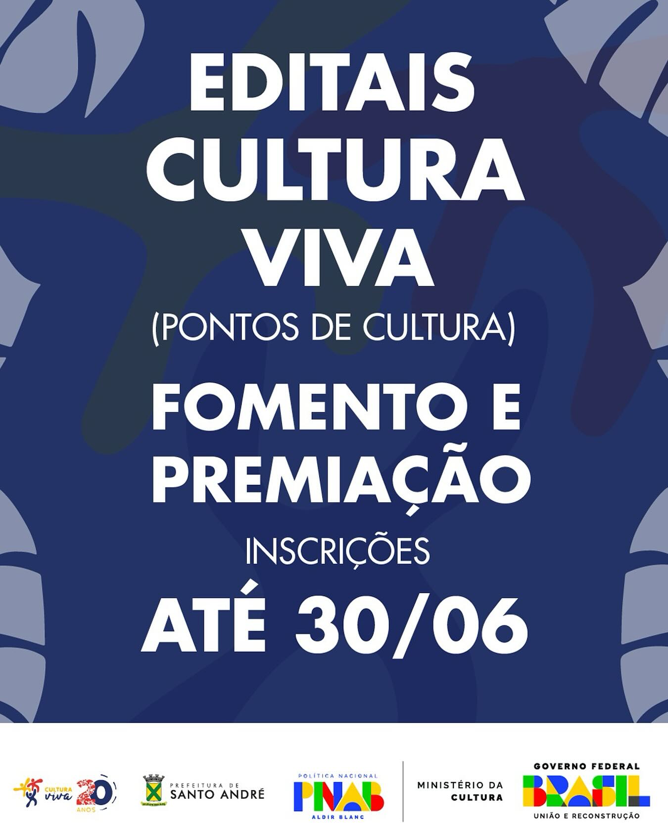 Estão abertas, de 20 de maio a 30 de junho de 2025, as inscrições para dois editais vinculados à Política Nacional Aldir Blanc (PNAB), com foco exclusivo na Política Nacional Cultura Viva (PNCV). As ações são realizadas com saldo remanescente do 1º ciclo da PNAB, executado em 2024, e têm como objetivo fortalecer a cultura popular, comunitária e tradicional, especialmente por meio da consolidação dos Pontos de Cultura no município de Santo André (SP).