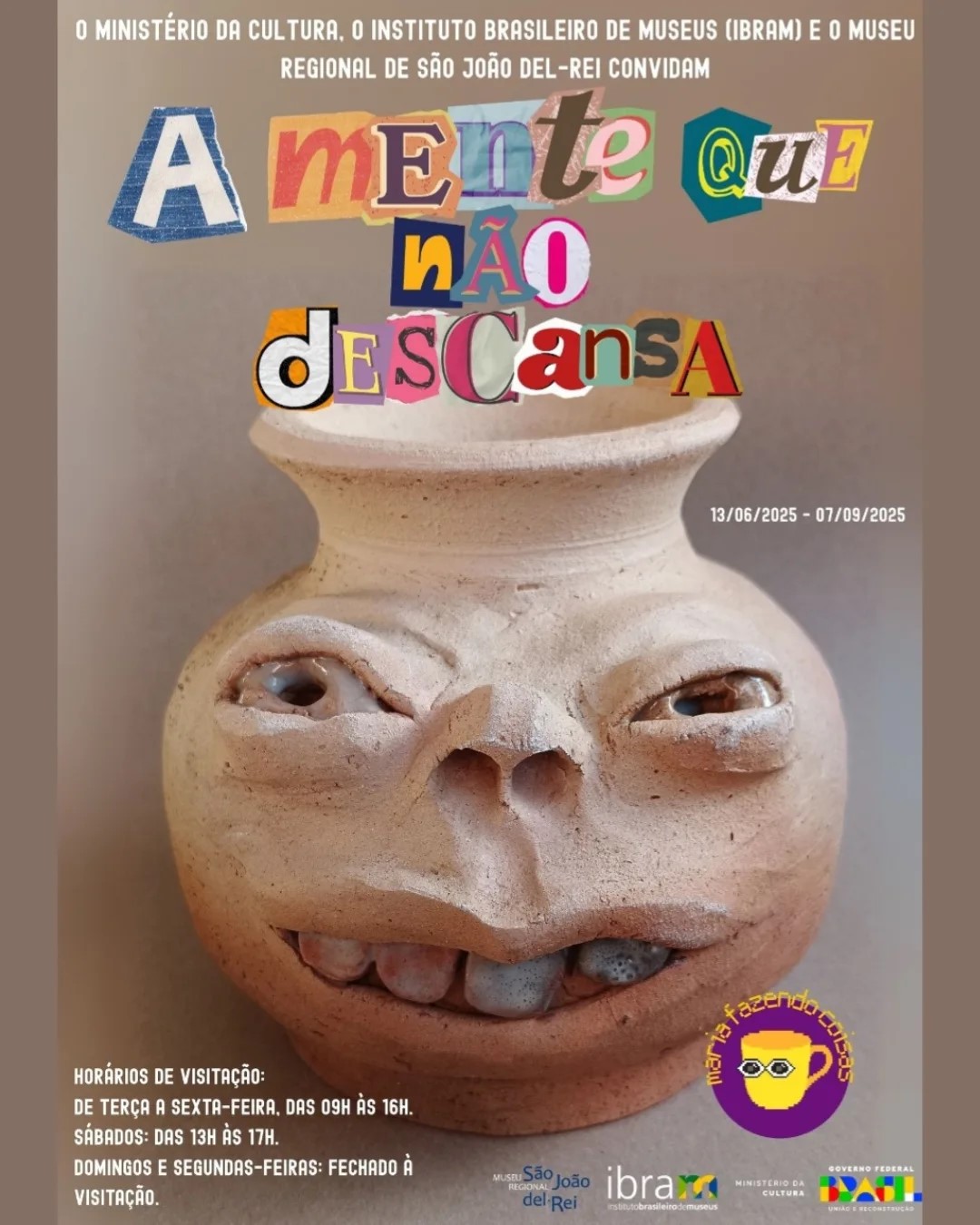 A exposição "A Mente que Não Descansa", da ceramista Maria Clara Neves, estará em cartaz no Museu Regional de São João del-Rei a partir do dia 13 de junho de 2025, com visitação gratuita até o dia 7 de setembro de 2025. A mostra reúne 16 peças em cerâmica esmaltada, todas com formas antropomórficas e animalescas, produzidas a partir de argilas de diferentes cores.
