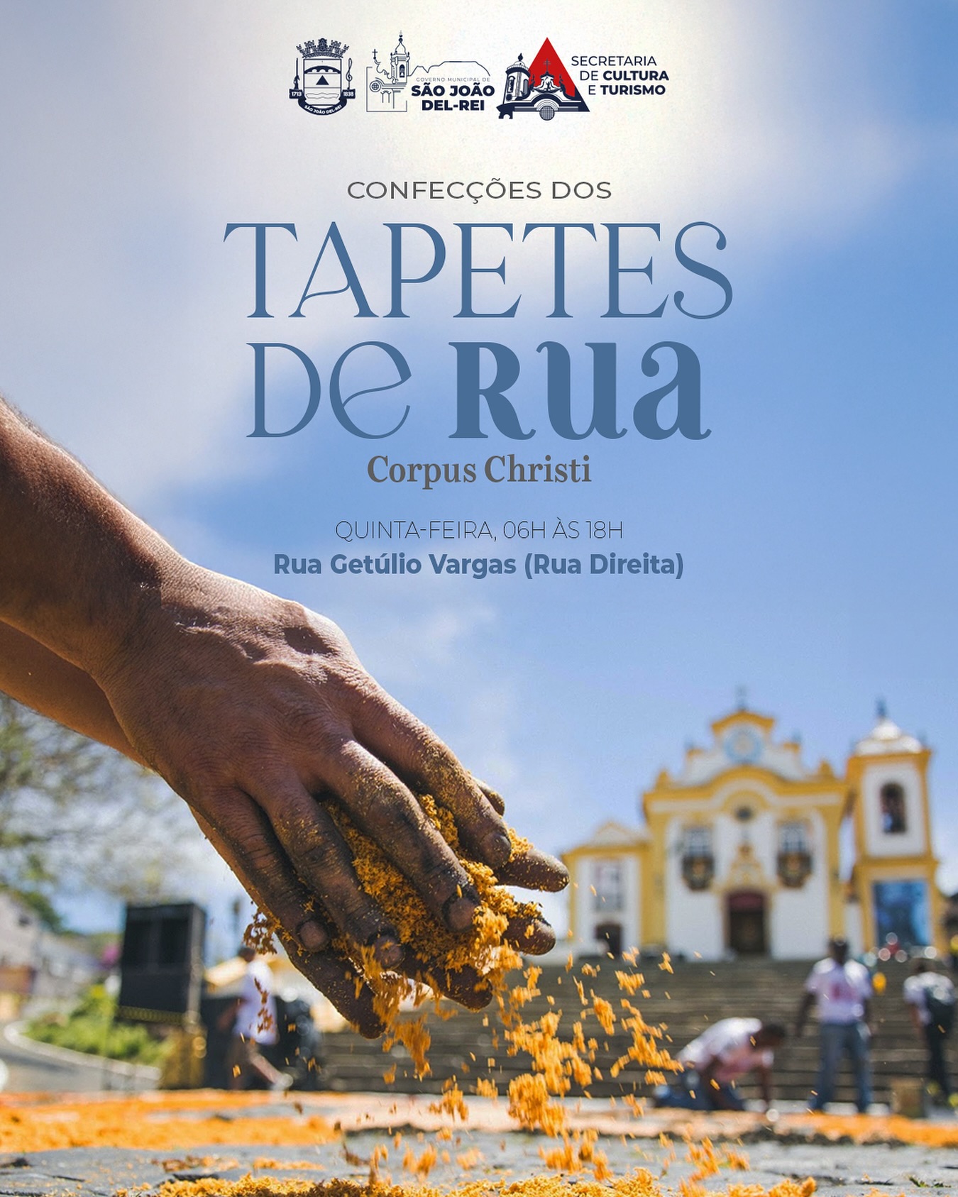 A tradicional Confecção dos Tapetes de Rua para o Corpus Christi acontecerá nesta quinta-feira, 19 de junho de 2025, na Rua Getúlio Vargas (Rua Direita), em São João del-Rei (MG). A atividade será realizada entre 6h e 18h, reunindo moradores, artistas e fiéis em uma manifestação coletiva de fé e arte.