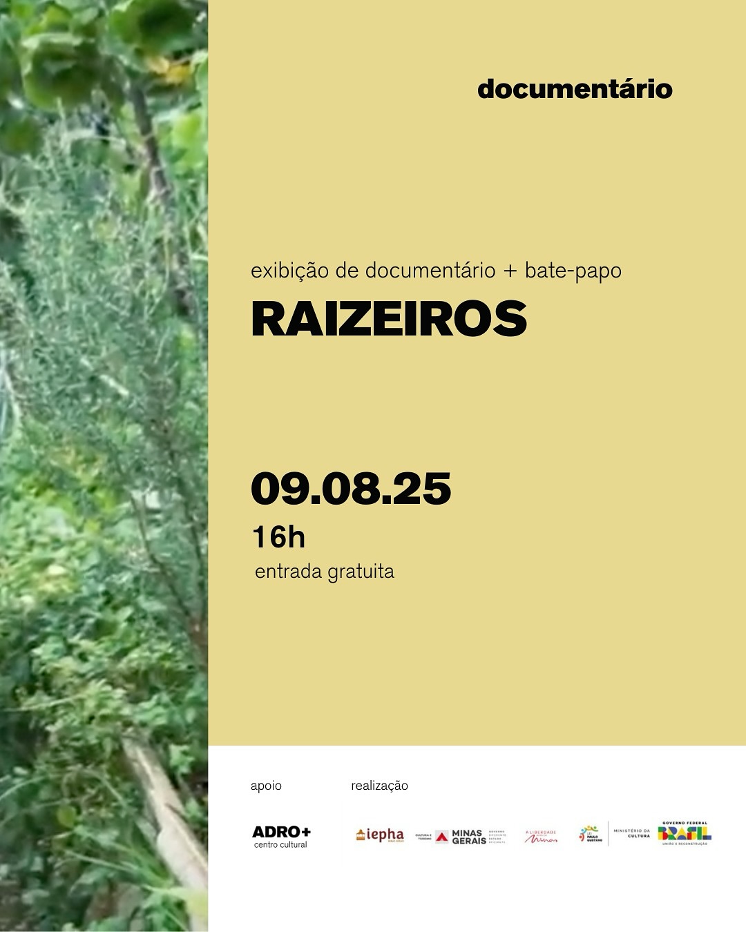 A galeria Adro+, localizada em São João del-Rei (MG), realiza no dia 9 de agosto de 2025, às 16h, a exibição do documentário "Raizeiros", seguida de um bate-papo sobre os saberes tradicionais e o uso de plantas medicinais. A atividade é gratuita e aberta ao público, promovendo o diálogo entre práticas ancestrais e questões contemporâneas de saúde e meio ambiente.