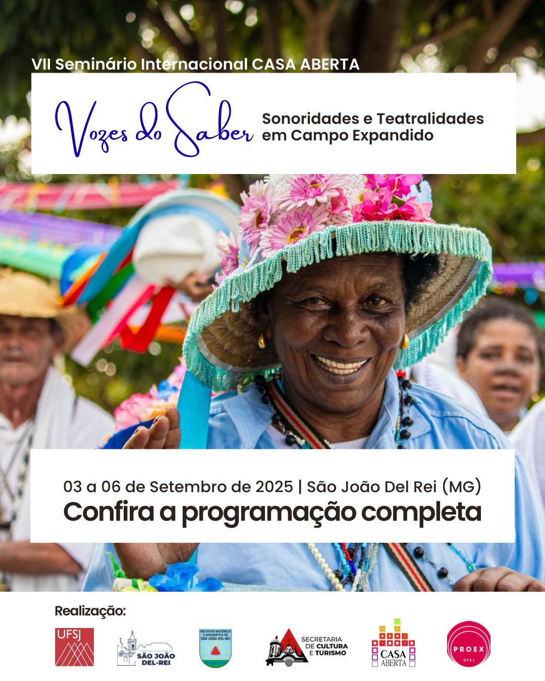 O VII Seminário Internacional CASA ABERTA: Vozes do Saber – sonoridades e teatralidades em campo expandido será realizado entre os dias 03 e 06 de setembro de 2025, em São João del-Rei (MG). O evento reunirá artistas, mestres de saberes tradicionais e pesquisadores do Brasil, Chile e França, com atividades gratuitas abertas ao público. A iniciativa é coordenada pelo Grupo de Pesquisa CASA ABERTA/UFSJ e pelo Projeto Vozes do Saber, em parceria com a Secretaria Municipal de Cultura e o Instituto Histórico e Geográfico de São João del-Rei.
