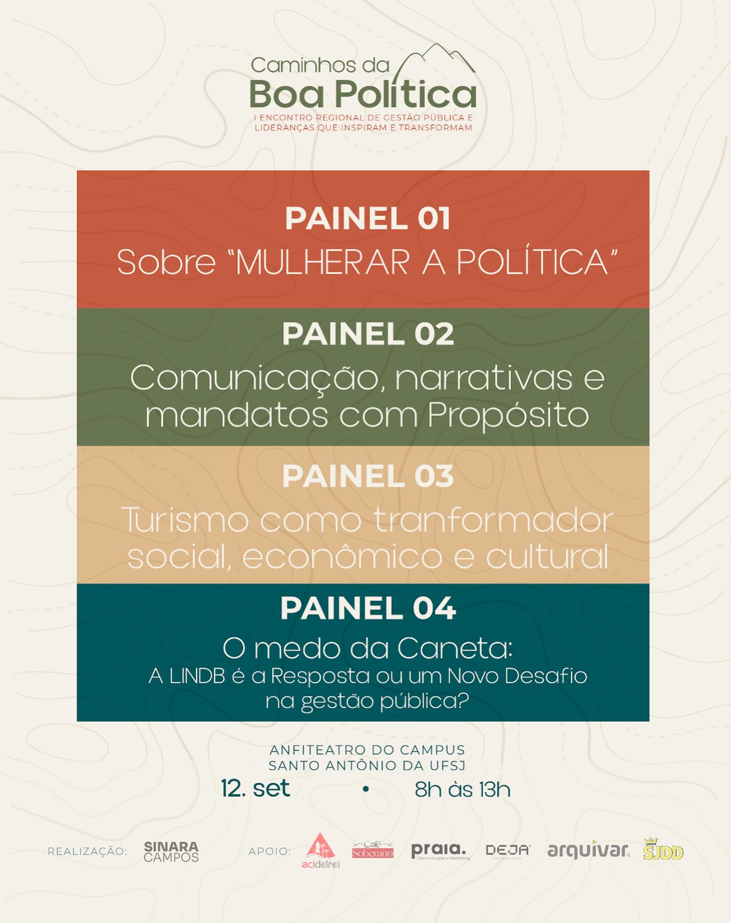 O Caminhos da Boa Política – I Encontro Regional de Gestão Pública e Lideranças que Inspiram e Transformam acontece no dia 12 de setembro de 2025, no Anfiteatro do Campus Santo Antônio da Universidade Federal de São João del-Rei (UFSJ). O evento é gratuito, conta com acessibilidade em Libras e está com inscrições abertas pela plataforma Sympla.