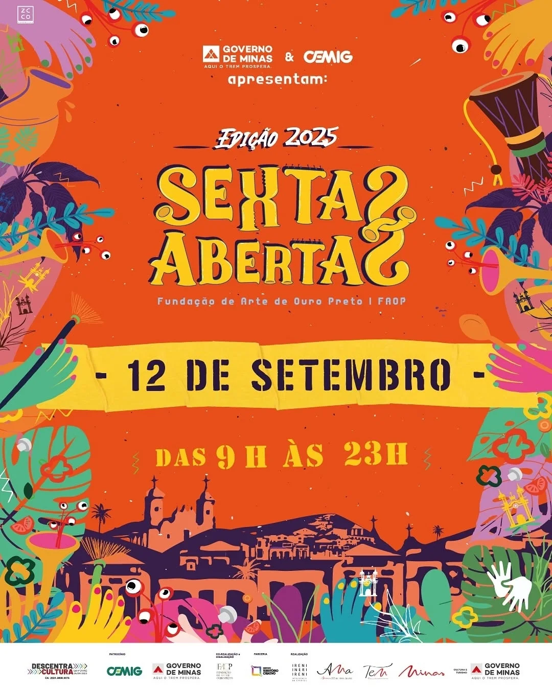 Sextas Abertas – Edição 2025 será realizado em 12 de setembro de 2025, em Ouro Preto, Minas Gerais, com atividades gratuitas e abertas ao público. As ações acontecem na sede do Núcleo de Artes e Ofícios da Fundação de Arte de Ouro Preto (FAOP) e na Praça Antônio Dias, sem necessidade de inscrição prévia.