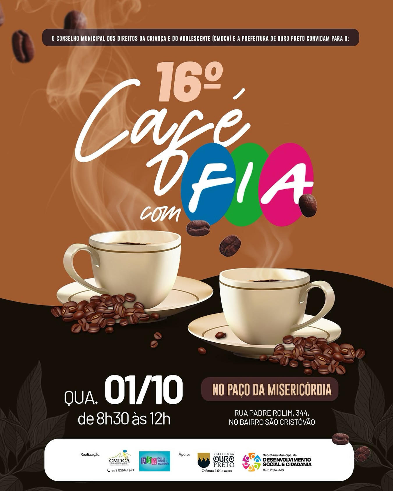 O Café com FIA chega à sua 16ª edição, consolidando-se como um evento de referência promovido pelo Conselho Municipal dos Direitos da Criança e do Adolescente (CMDCA), pela Prefeitura de Ouro Preto e por organizações da sociedade civil voltadas à proteção e promoção dos direitos de crianças e adolescentes. O evento tem como objetivo apresentar a prestação de contas do Fundo da Infância e da Adolescência (FIA), que recebe recursos por meio da destinação do Imposto de Renda.