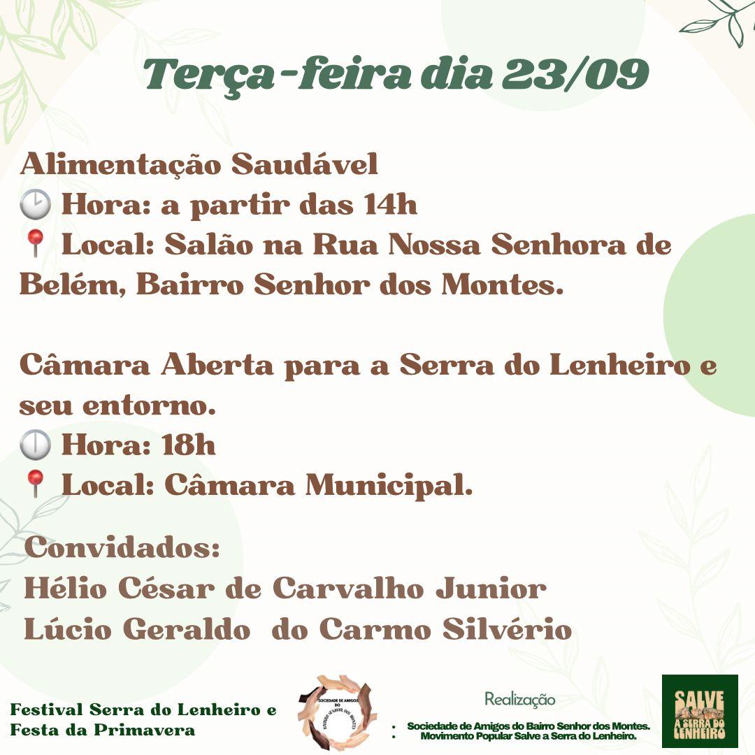Às 18h, a programação continua com a Câmara Aberta para a Serra do Lenheiro, realizada na Câmara Municipal. A iniciativa reúne especialistas, lideranças comunitárias e a população em um espaço de debate público sobre a preservação da serra, seus desafios e propostas de políticas ambientais.