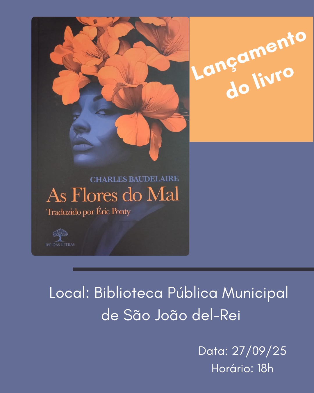 O lançamento do livro "As Flores do Mal", do escritor francês Charles Baudelaire, será realizado em 27 de setembro de 2025, às 18h, na Biblioteca Pública Municipal de São João del-Rei. A obra chega em uma nova tradução para o português, realizada pelo escritor são-joanense Éric Ponty, e é publicada pela IPÊ das Letras.