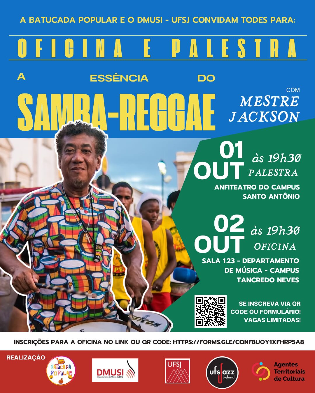 A Oficina com Mestre Jackson – Essência do Samba Reggae acontece em São João del-Rei em dois momentos especiais. A iniciativa é promovida pela Batucada Popular em parceria com o Departamento de Música da UFSJ (DMUSI) e traz à cidade um dos maiores nomes da percussão afro-baiana. Reconhecido internacionalmente, Mestre Jackson foi precursor do Samba Reggae ao lado de Neguinho do Samba e colaborou com artistas como Caetano Veloso, Gilberto Gil, Gal Costa, Daniela Mercury, Timbalada e Baiana System.