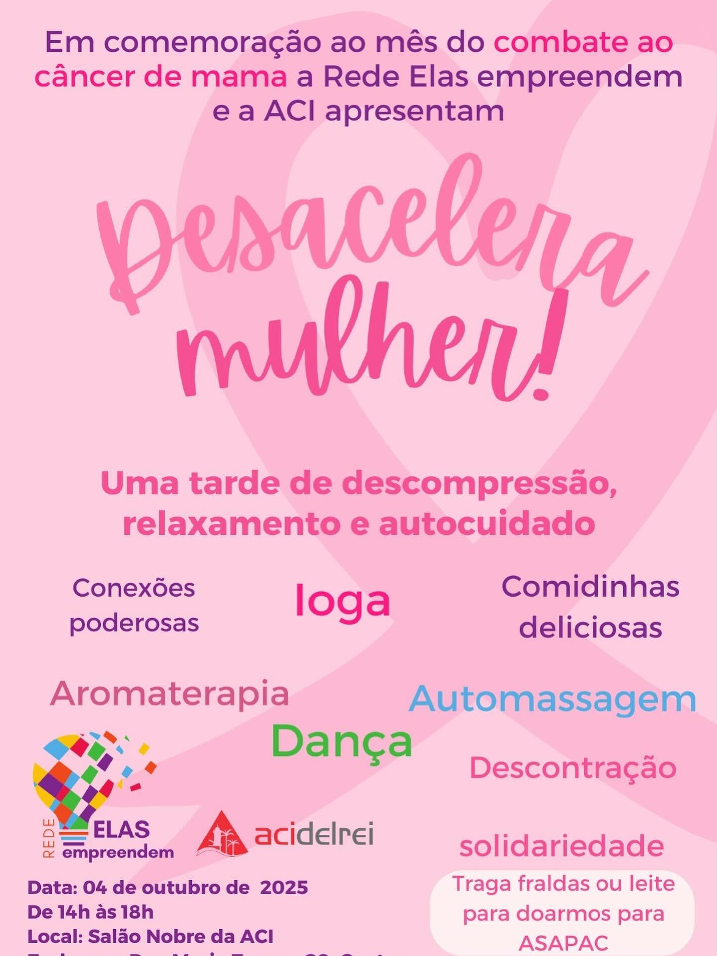 O evento Desacelera, Mulher! será realizado no dia 04 de outubro de 2025 (sábado), das 14h às 18h, no Salão Nobre da ACI, em São João del-Rei (MG). A iniciativa é promovida pela Rede Elas Empreendem em parceria com a Associação Comercial e Industrial (ACI), em alusão ao Outubro Rosa, mês de conscientização sobre o câncer de mama.