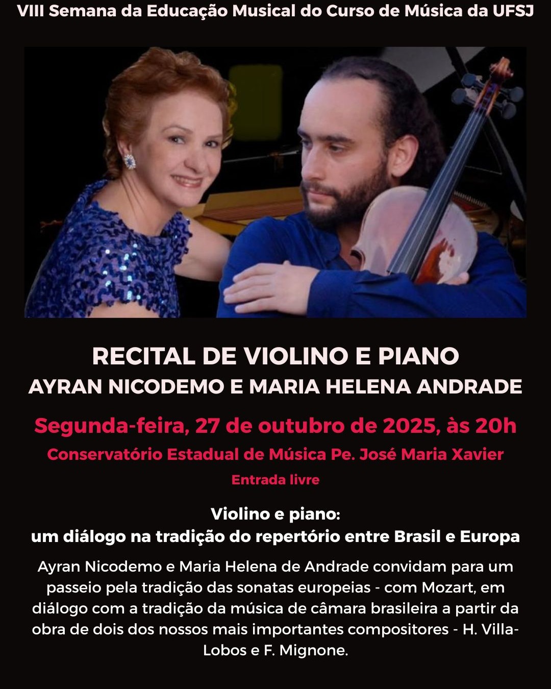 O recital, intitulado “Violino e Piano: um diálogo na tradição do repertório entre Brasil e Europa”, propõe um percurso pela música de câmara, conectando a tradição das sonatas europeias de Mozart com a riqueza do repertório brasileiro de Heitor Villa-Lobos e Francisco Mignone. A proposta busca evidenciar o diálogo entre culturas e estilos, evidenciando as influências e interseções musicais entre os dois continentes.