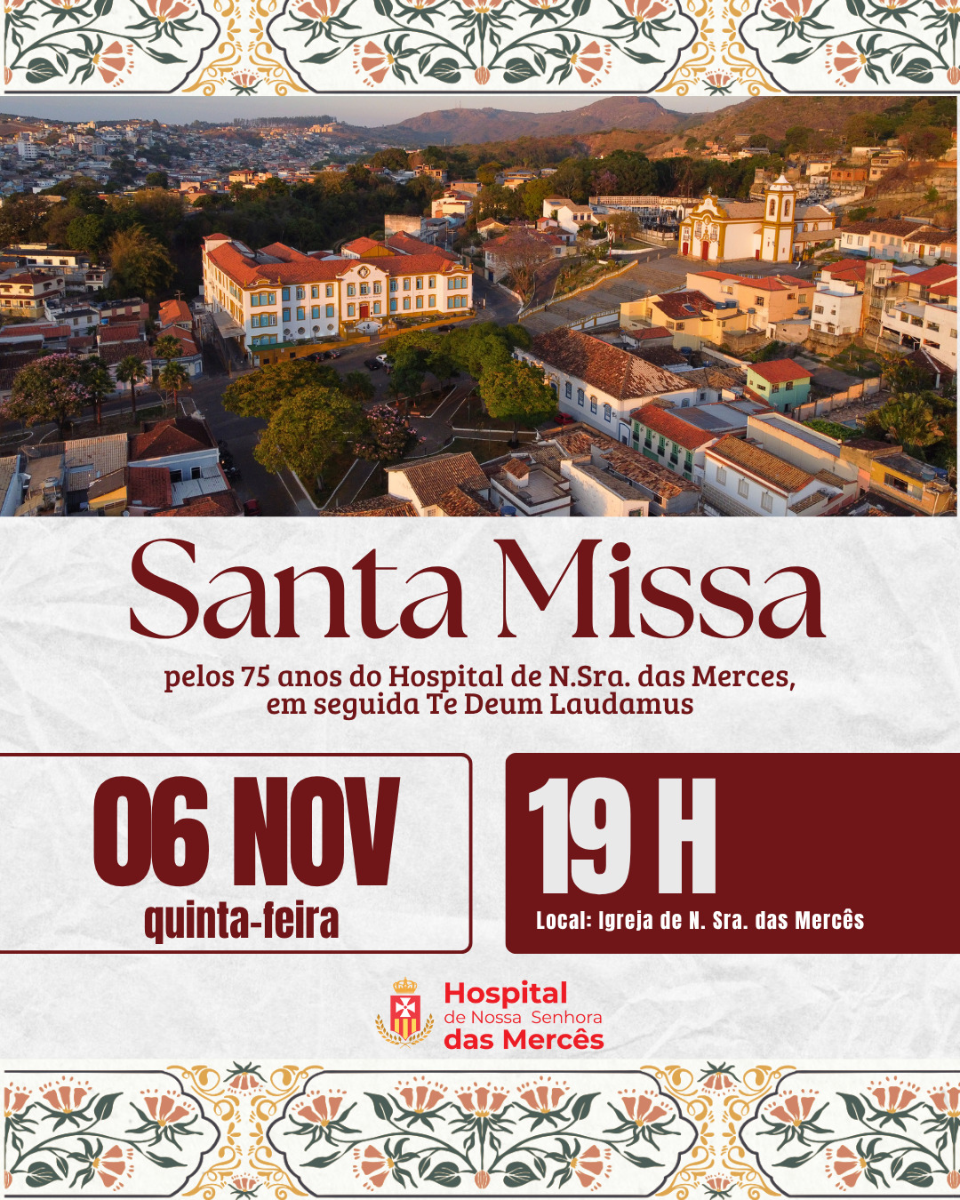 O Hospital Nossa Senhora das Mercês celebra seus 75 anos de fundação com uma Santa Missa comemorativa, que será realizada no dia 6 de novembro de 2025 (quinta-feira), às 19h, na Igreja de Nossa Senhora das Mercês, em São João del-Rei (MG). O evento marca um momento de fé, gratidão e reconhecimento pela trajetória da instituição, que se tornou referência em saúde e humanização ao longo de mais de sete décadas de atuação.