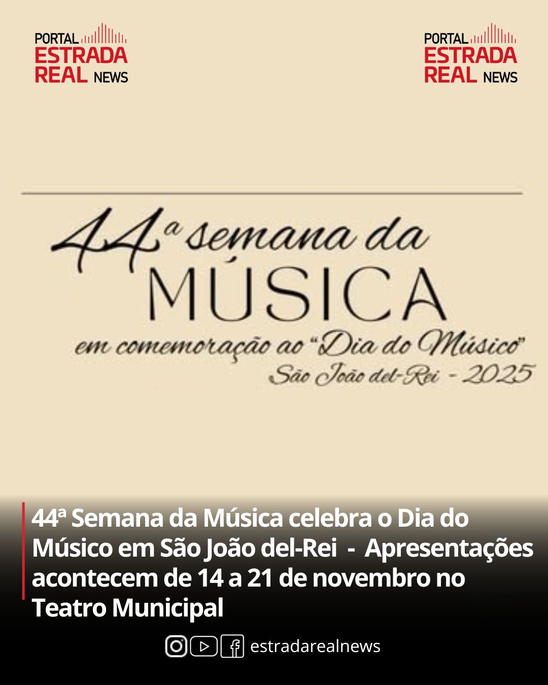 A 44ª Semana da Música de São João del-Rei será realizada entre os dias 14 e 21 de novembro de 2025, no Teatro Municipal, em comemoração ao Dia do Músico. O evento é promovido pela Banda Theodoro de Faria, em parceria com instituições locais e de Santa Cruz de Minas, reunindo diversas corporações musicais, orquestras e bandas da região.