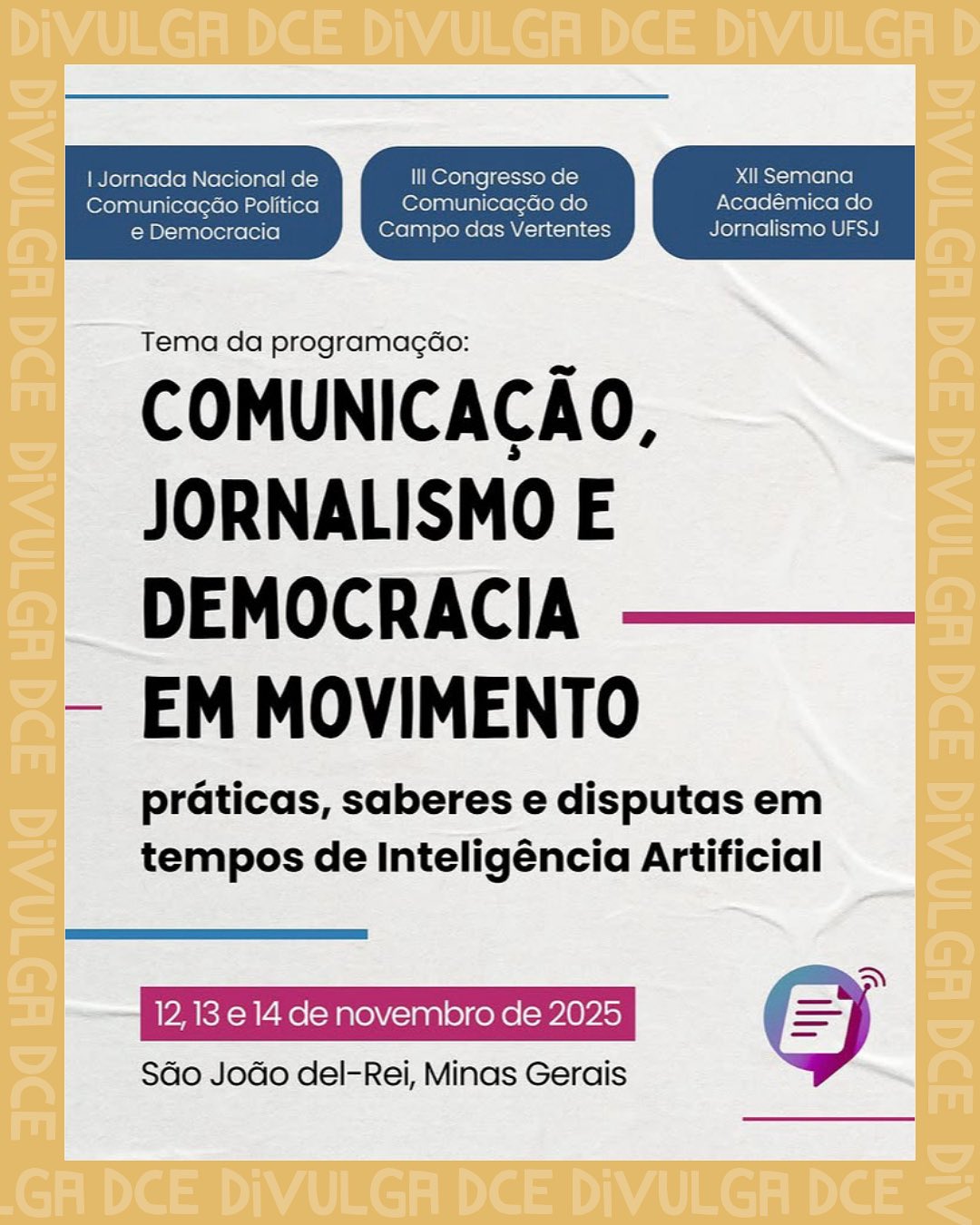 Entre os dias 12 e 14 de novembro de 2025, acontece em São João del-Rei (MG) a I Jornada Nacional de Comunicação Política e Democracia, o III Congresso de Comunicação do Campo das Vertentes e a XII Semana Acadêmica do Jornalismo UFSJ, reunidos sob o tema “Comunicação, Jornalismo e Democracia em Movimento: práticas, saberes e disputas em tempos de Inteligência Artificial”. O evento contará com mesas-redondas, oficinas e minicursos, além de debates sobre o papel da comunicação e do jornalismo na era digital.