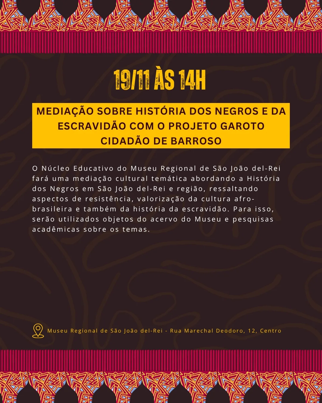 A mediação será conduzida pelo Núcleo Educativo do museu, que abordará temas relacionados à trajetória dos negros em São João del-Rei e cidades vizinhas. O encontro enfatiza processos de resistência, práticas culturais e formas de organização social que marcaram a história afro-brasileira na região, promovendo um olhar crítico sobre os impactos da escravidão e seus desdobramentos.