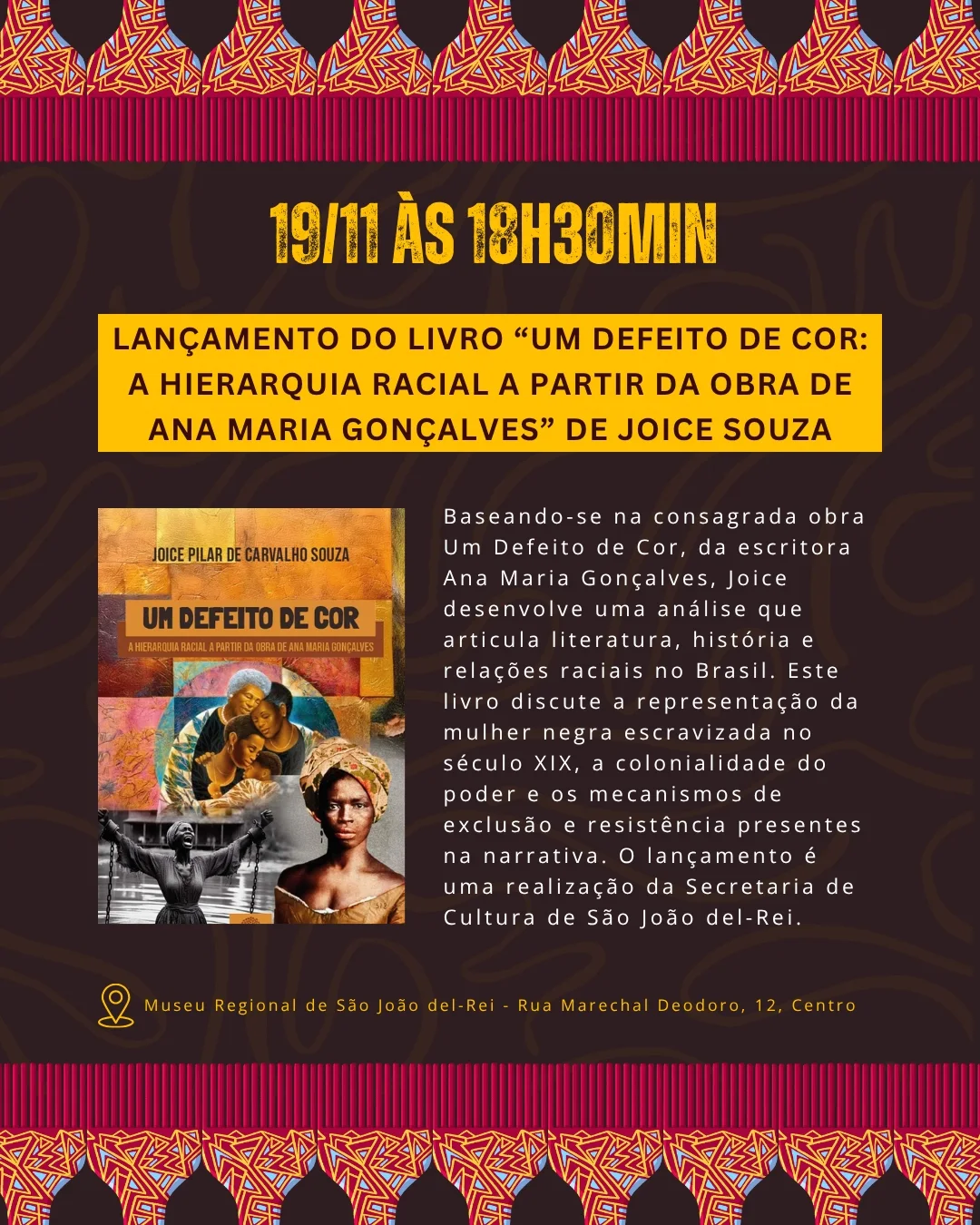O lançamento do livro "Um Defeito de Cor: A Hierarquia Racial a partir da Obra de Ana Maria Gonçalves", de Joice Souza, será realizado em 19 de novembro, às 18h30, no Museu Regional de São João del-Rei (Rua Marechal Deodoro, 12, Centro). O evento integra a programação cultural do município e reforça debates sobre literatura, história e relações raciais no Brasil.