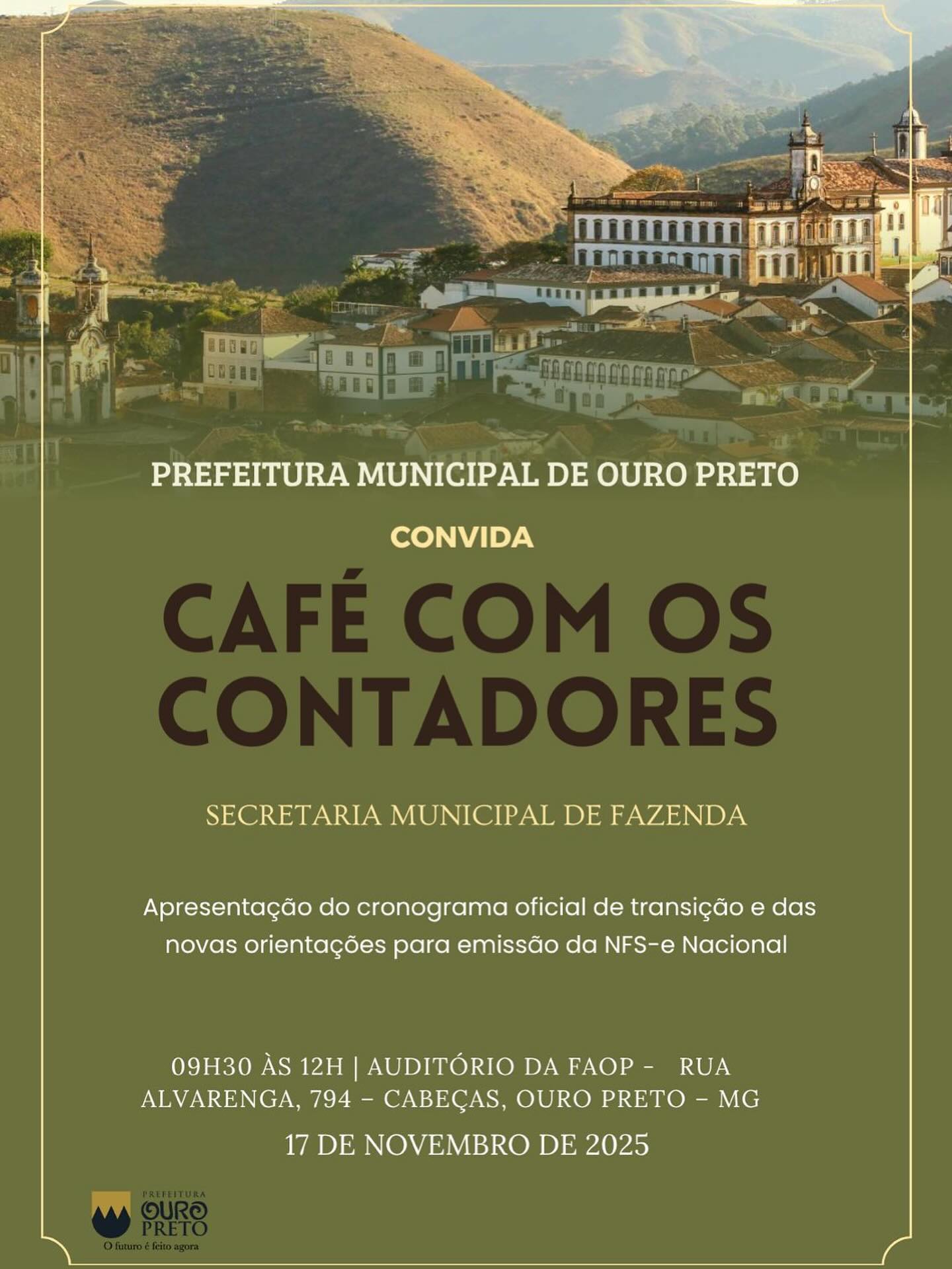 O Café com Contadores, promovido pela Prefeitura Municipal de Ouro Preto, será realizado em 17 de novembro de 2025, às 9h30, no Auditório da FAOP. O encontro tem como objetivo apresentar atualizações relevantes para profissionais da área contábil, especialmente no que diz respeito às mudanças na emissão da NFS-e Nacional.