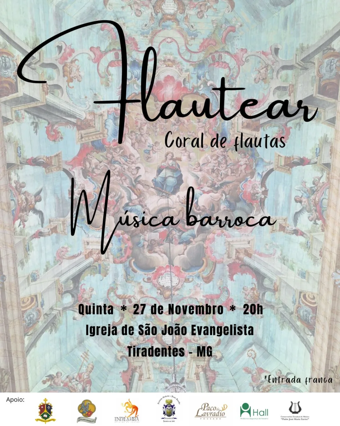 O Coral de Flautas Flautear realizará dois concertos dedicados ao repertório barroco, com obras de Johann Sebastian Bach, Antonio Vivaldi, Georg Friedrich Händel e do compositor mineiro Manoel Dias de Oliveira, referência histórica ligada às tradições musicais de Tiradentes e São João del-Rei. As apresentações fazem parte da agenda cultural das duas cidades e buscam aproximar o público da música erudita produzida entre os séculos XVII e XVIII.