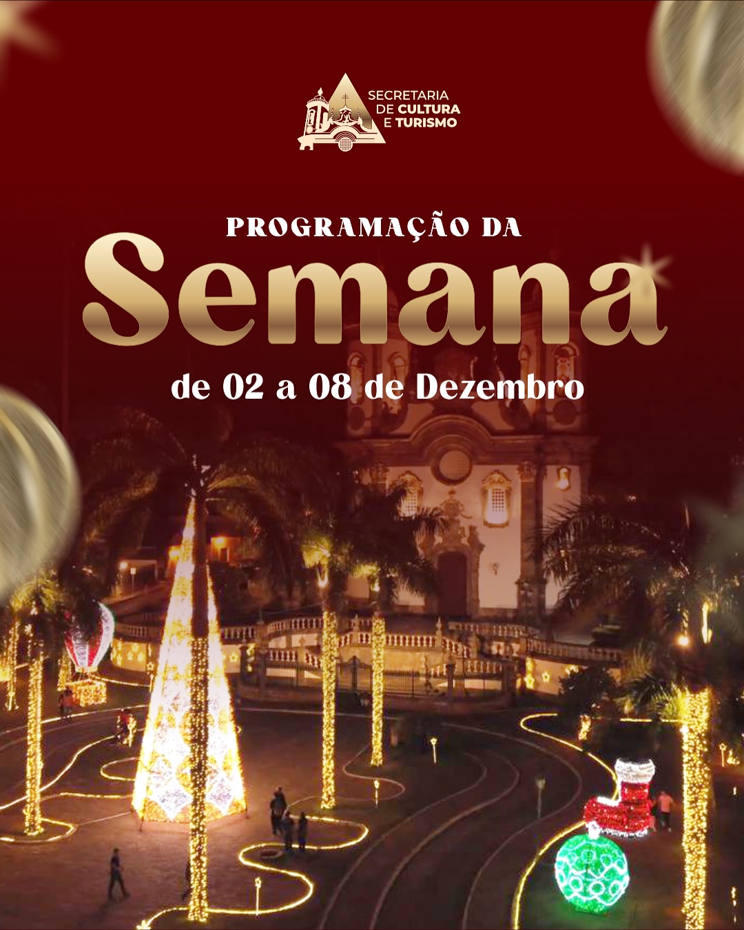 Encanto de Natal de São João del-Rei apresenta uma nova semana de programação entre 02 e 08 de dezembro, promovida pela Secretaria Municipal de Cultura e Turismo. As atividades incluem apresentações musicais, shows especiais e eventos que reforçam a tradição natalina da cidade, com ações que ocorrem em diferentes praças e avenidas. Toda a programação é gratuita e aberta ao público.