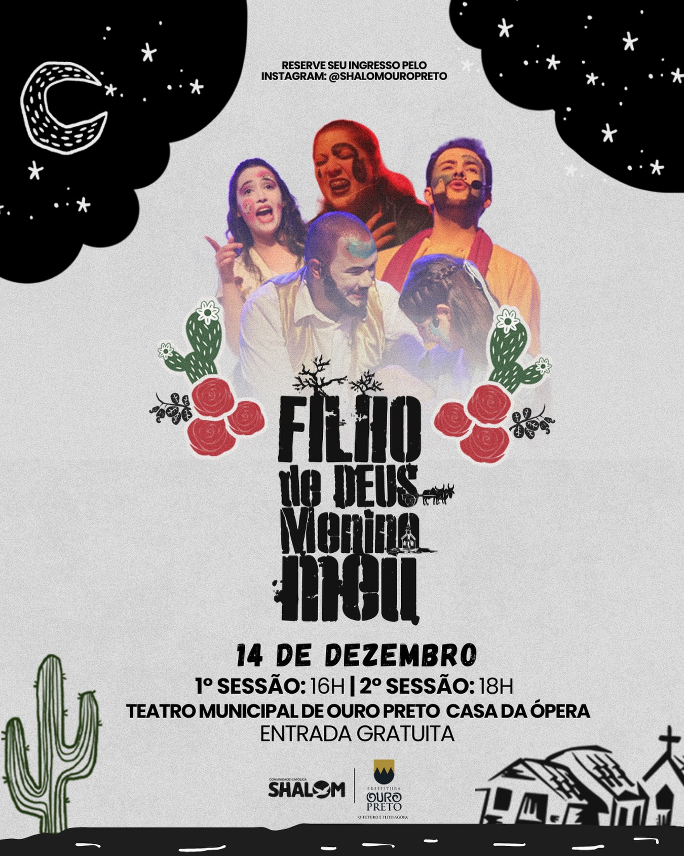 Filho de Deus, Menino Meu é um espetáculo musical tradicional que será apresentado no dia 14 de dezembro, no Teatro Municipal de Ouro Preto – Casa da Ópera, com entrada gratuita. A montagem conta duas sessões no mesmo dia, às 16h e às 18h, e integra a programação cultural da cidade. Os ingressos podem ser reservados pelo Instagram @shalomouropreto.