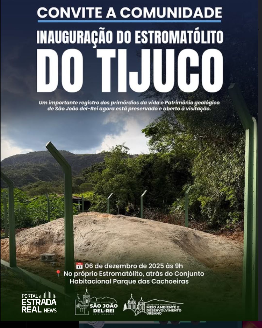 A Inauguração do Estromatólito do Tejuco será realizada no dia 06 de dezembro de 2025, às 9h, no próprio sítio geológico, localizado atrás do Conjunto Habitacional Parque das Cachoeiras, em São João del-Rei. O estromatólito é considerado um dos mais antigos registros de vida na Terra, formado por cianobactérias e datado de aproximadamente 3,5 bilhões de anos, configurando-se como um patrimônio geológico de grande relevância.