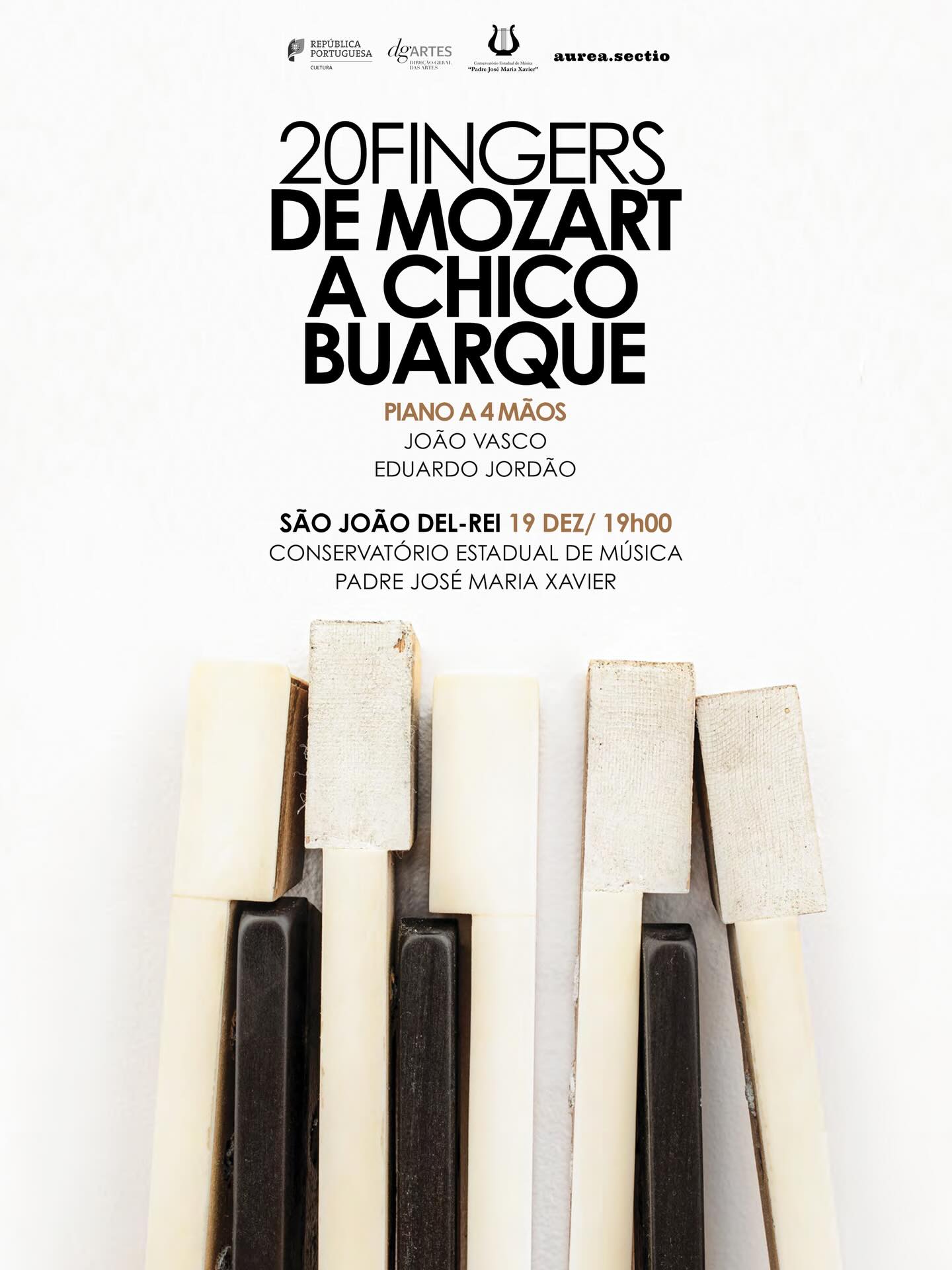 O recital “De Mozart a Chico Buarque” será realizado em 19 de dezembro de 2025, em São João del-Rei (MG), com entrada gratuita, como parte de uma apresentação especial do duo português 20fingers, formado pelos pianistas João Vasco e Eduardo Jordão. O concerto integra a programação cultural da cidade e ocorre por meio de parceria entre a série aurea.sectio e o Conservatório Estadual de Música “Pe. José Maria Xavier”, instituição referência na formação musical da região.