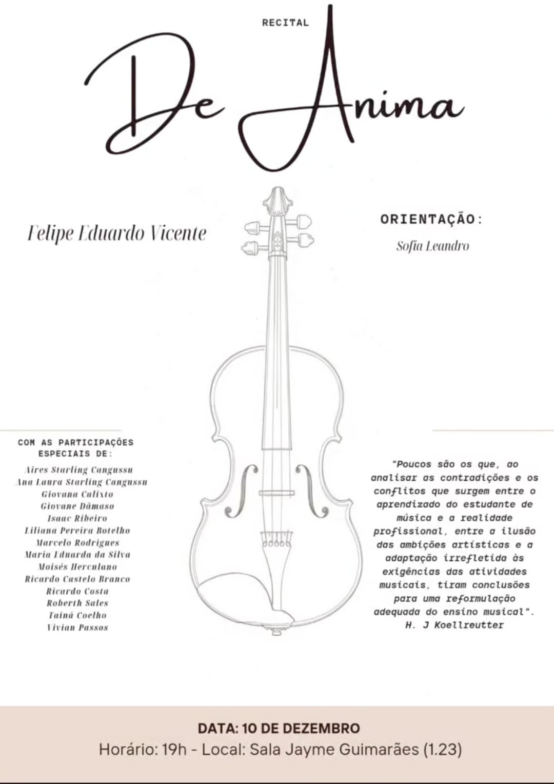 A apresentação contará com a participação de músicos convidados, que atuarão como parceiros camerísticos ao longo da noite. O recital tem como proposta apresentar a produção artística do aluno de viola e promover o intercâmbio entre estudantes, docentes e comunidade externa da universidade.